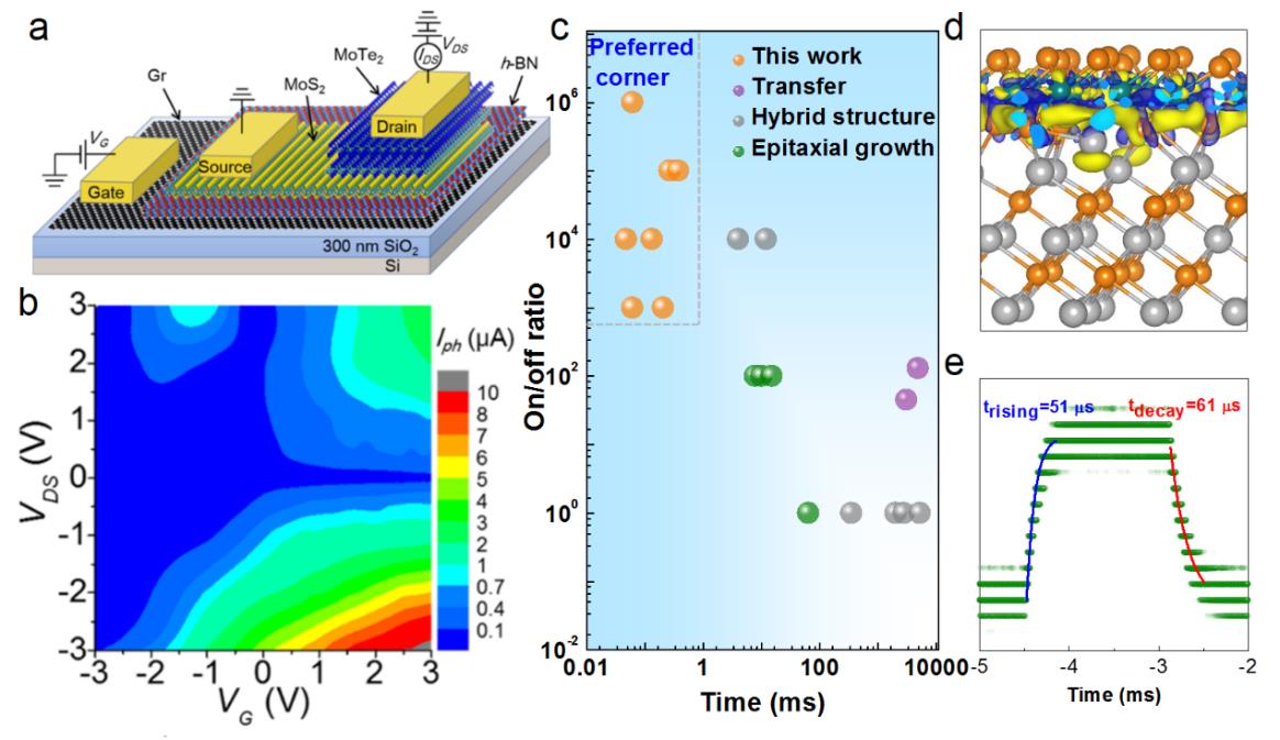 范德华异质结具有出色的光电性能,但是范德华间隙引入的隧穿势垒限制了其在光电探测方面的应用。范德华间隙显着增加了光生载流子的注入势垒。日前,何军课题组展示了一种通用策略,可以消除范德华异质结中的范德华间隙。何军课题组通过退火的方式诱导出过渡金属硫族化物的空位,使其与非层状硫族化物半导体的界面悬挂键通过强的轨道杂化来桥接,从而消除范德华异质结中的范德华间隙。该异质结器件展现出优异的光电探测性能。许多性能指标均超同类范德华异质结器件几个数量级,比如,桥接的PbS / ReS2,PbS / MoSe2和PbS / MoS2展现出超快的光响应时速度分别为30 μs,51 μs和43 μs,桥接的PbS / MoS2和ZnTe / MoS2异质结构的光触发开/关比超过106和105。相关研究成果日前以“Bridging the van der Waals interface for advanced optoelectronic devices”为题发表在Advanced Materials(doi.org/10.1002/adma.201906874)上。