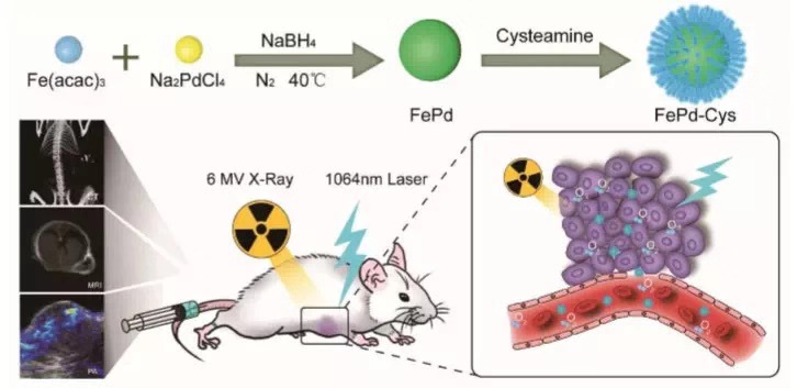 为了解决以上问题,研究者设计了一种能简便合成在第二近红外(NIR-II)生物窗(1000~1700μnm)起作用的超小半胱胺(Cys)包覆FePd双金属纳米点(NDs)。实验测试表明,这些NDs产生了高达35.4%的热疗,同时因为其光热转化效应使肿瘤组织中的缺氧得到了改善,并且材料本身能在肿瘤细胞中沉积辐射能量,这些作用大大增强了肿瘤细胞对放疗的敏感性。与此同时NDs还能作为体外和体内三模态成像的造影剂,包括计算机断层扫描(CT)、磁共振成像(MRI),以及光声成像(PAI)。这种材料的出现将大大加强光热治疗联合热放疗疗法的疗效,有非常重要的科研及临床价值。