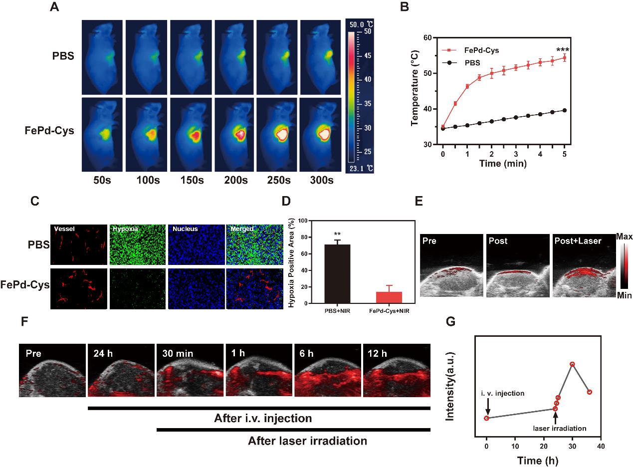 图2(A)FePd-Cys纳米点的体内实时光热效果热像图及(B)升温曲线;(C)肿瘤组织切片的免疫荧光染色;(D)荧光强度图;(E)尾静脉注射FePd-Cys纳米点前,注射药物24h后及近红外光照射30min后体内肿瘤血氧含量分布;(F)注射药物前,注射药物24h后,近红外光照射30min,1h,6h,12h后体内肿瘤血氧含量分布以及(G)随时间变化的血氧含量图。