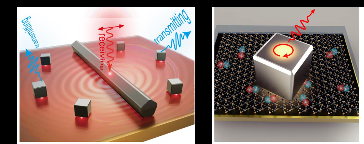 在一般的纳腔体系中,激发光斑直接照射会带来较强的干扰性背景和破坏性加热效应,这影响了纳腔在增强光谱方面的许多应用。近期,课题组利用银纳米立方置于金膜上(nanocube over mirror, NCOM)与银纳米线置于金膜上(nanowire over mirror, NWOM) 构建了一个激发-收集分离且阻抗匹配的纳米天线对(图二a)。它们所形成的等离激元纳腔具有高度的相似性——均为磁偶极共振模式、均能提供很大的电磁场增强以及垂直向上的辐射方向性。课题组以NWOM作为接收天线耦合自由空间中的光并充当表面等离激元的发射器,产生的表面等离激元沿金膜表面传播,其电场方向垂直于金膜表面,可以高效地激发发射端的纳米天线(NCOM)。这种激发和辐射功能分离的构型抑制了直接激发带来的光热以及背景噪声,确保了高信噪比。此外,通过一个概念验证实验表明,当接收端和发射端共振波长匹配时,可以实现近场“热点”的转移,从而实现远程表面增强拉曼光谱对极低浓度的分析物的检测。这种新型表面等离激元器件可为生化检测、非线性光学转换和无线光通信等方面提供新的设计思路。这一成果以题为“Duplicating Plasmonic Hotspots by Matched Nanoantenna Pairs for Remote Nanogap Enhanced Spectroscopy”的论文发表在《Nano Letters》上。