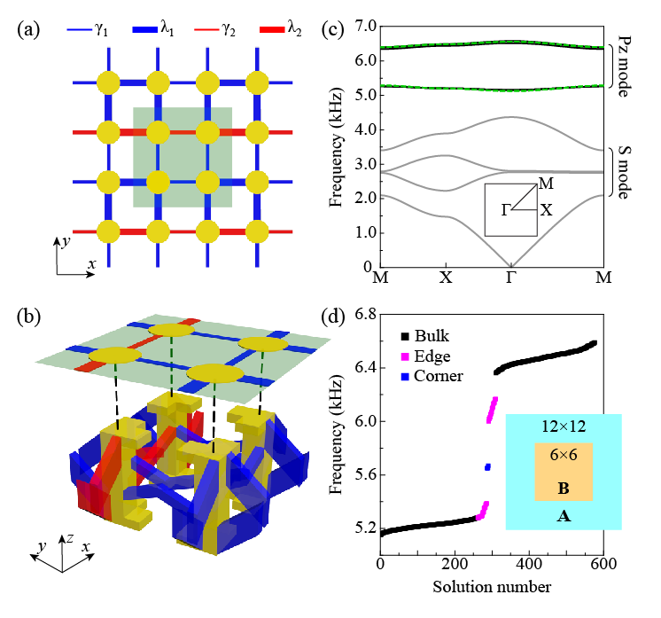 最早提出且极具代表性的高阶拓扑绝缘体是二维四极子拓扑绝缘体。对比于其它二维高阶拓扑绝缘体,四极子拓扑绝缘体具备手性对称性,其角态(即零维边界态)钉扎在体带隙中间,从而更具拓扑稳定性。尽管受到人们的广泛关注,迄今为止,相关的实验研究依然相当有限。究其原因在于,四极子拓扑绝缘体要求体系同时具备正和负的实耦合——这是一个非常苛刻的条件。这项研究介绍了一个简单直接、易于实施的方案设计声学耦合的符号(图1),构建了严格满足原始四极子拓扑绝缘体紧束缚模型的声学类比(图2),进而实验观察到了体系的层级拓扑特性(图3)。这些具有拓扑鲁棒性的带隙态可望在声学传感或声能捕获等方面获得应用。