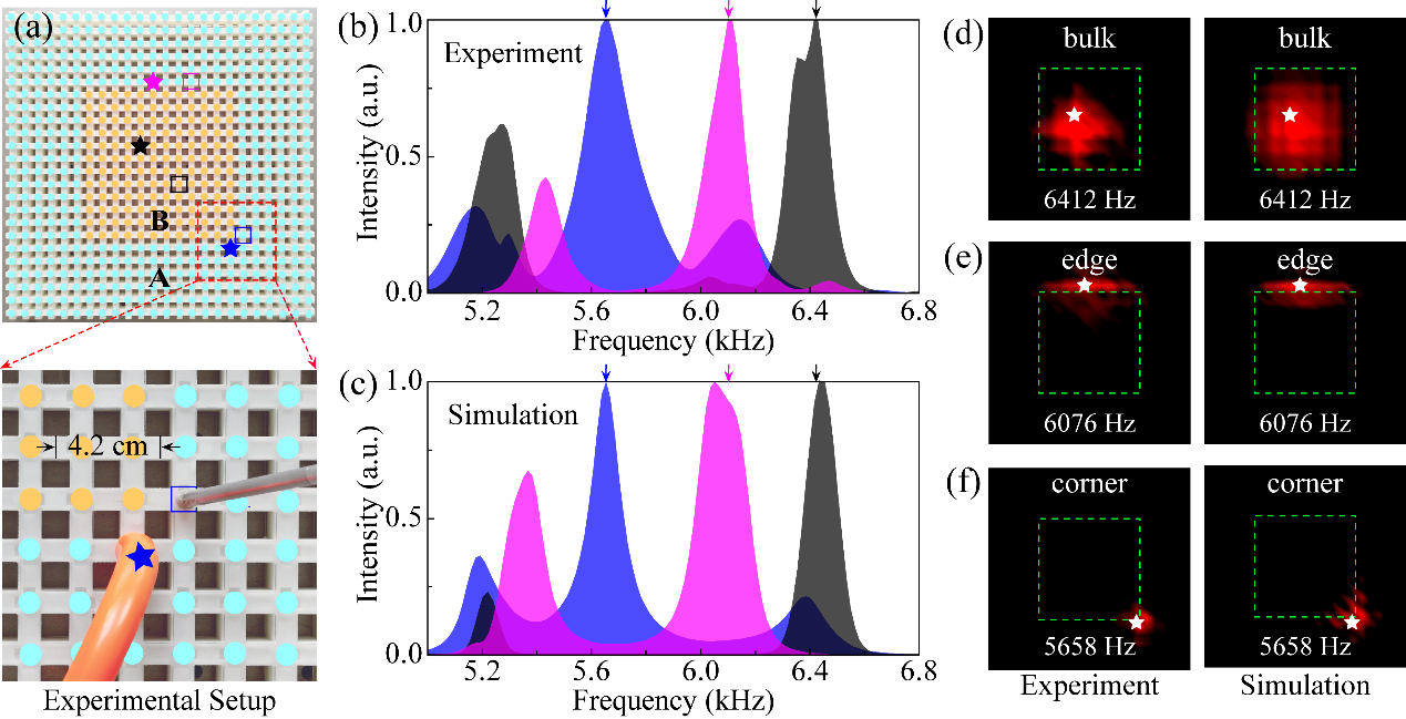 图3:实验检测声学四极子拓扑绝缘体的边缘态和角态
