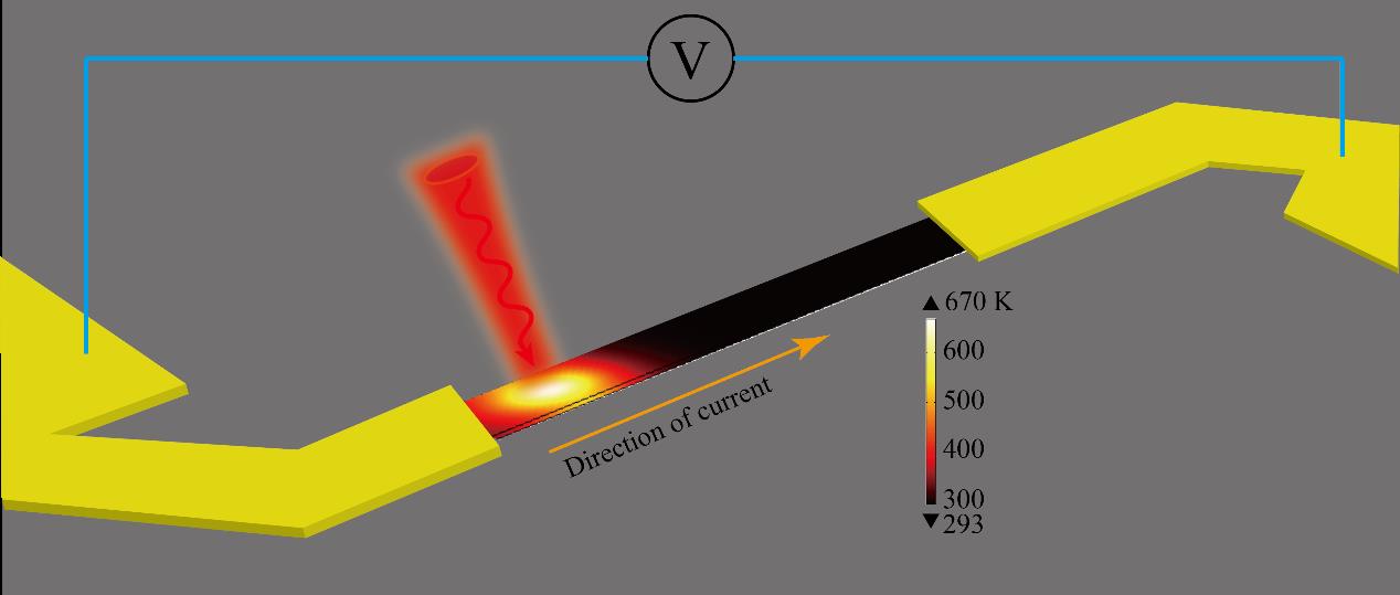 图1:硅纳米带光电探测器的结构示意图及光热电效应机制和载流子温度场分布