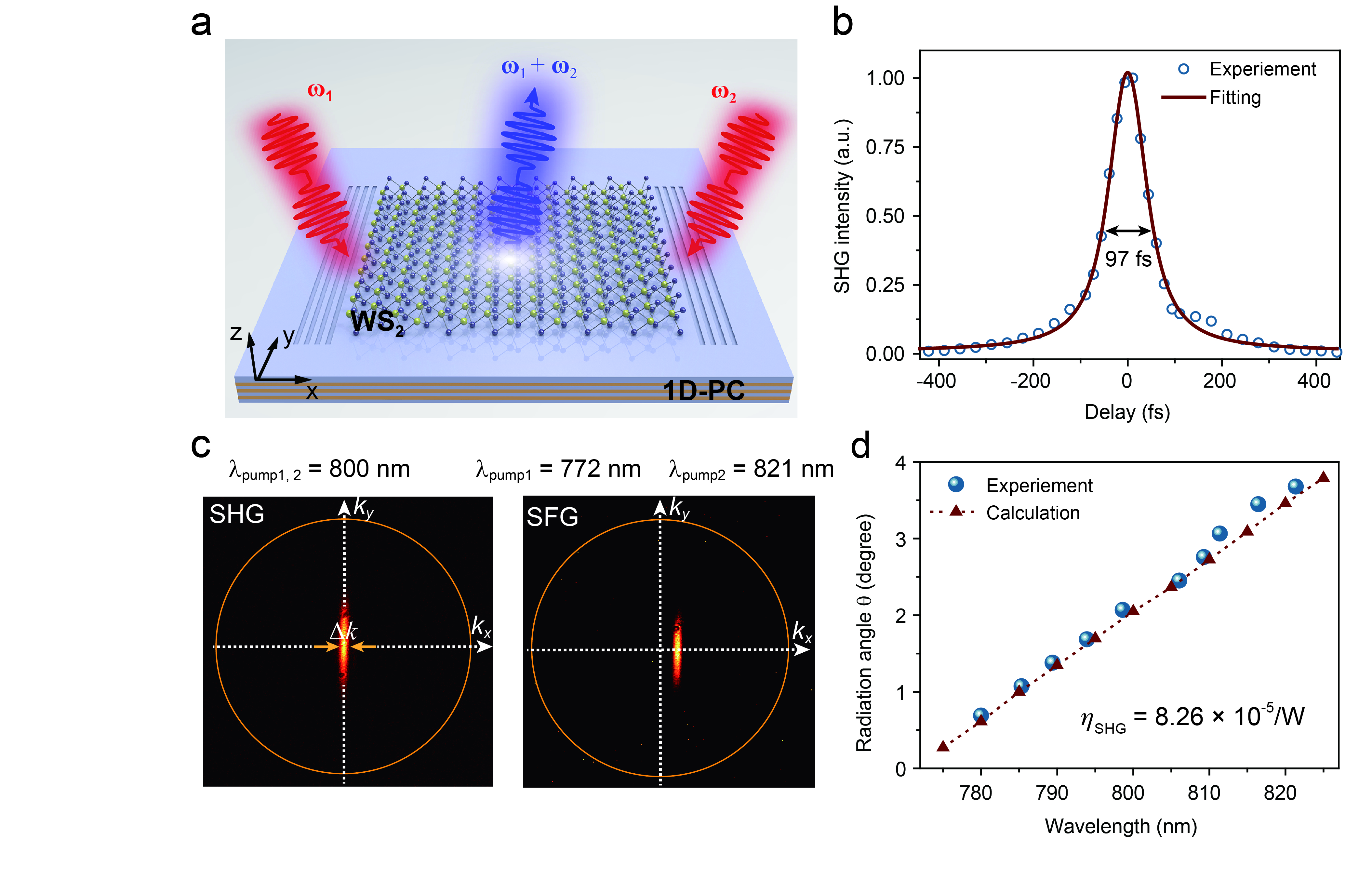 徐红星教授课题组结合一维光子晶体与单层二硫化钨(WS2),利用布洛赫表面波低损耗、电场增强大、横电场分布的特点,同时提高波导与WS2的时间和空间重叠度,利用相向激发的方式打破常规非线性相位匹配条件的限制(图a),使得WS2二阶非线性转换效率提高了三个数量级。通过控制两束激发光的相对延迟,表征了超短激光的脉宽(图b)。接着利用傅立叶成像技术研究了二倍频以及和频信号的空间辐射特征(图c),证明了非线性频率转换过程中的动量守恒。通过改变激发频率更改布洛赫表面波的波矢差,进而实现和频信号的定向准直辐射(图d)。该研究成果为增强光与物质的非线性相互作用提供了新的方案,有助于促进低维半导体材料在集成非线性相干光源方面的应用。