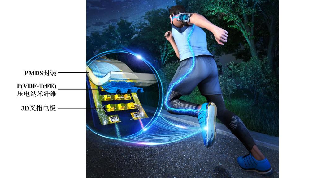 铁电共聚物P(VDF-TrFE)不仅具有较高的压电系数,而且质地柔软、抗辐照能力强、耐腐蚀以及生物兼容性好,因此该材料很适合用于可穿戴器件中。然而,基于该材料体系制备的压电能量收集器的发电功率相对较低,为了提升器件的机电转换性能,研究团队首次将有序P(VDF-TrFE)纳米纤维与三维的叉指电极结构相结合,同时提升了压电能量收集器的输出电压值和短路电流值。相比于传统的上下电极结构,该三维叉指电极结构不仅能增加与压电纤维的接触面积,使得更多的感应电荷被提取出来;而且在同样的外力作用下,三维电极结构能增大纳米纤维的形变程度,从而提高了器件的输出电压。将该器件直接穿戴于鞋子中,通过外连一个整流电路,脚部运动的机械能可直接转化为电能,即人体的运动可直接给用电器供电。值得注意的是,该电能可随时随地获取,用户再也不用担心充电问题,因此该器件有望应用于低功耗的可穿戴自供电设备中。