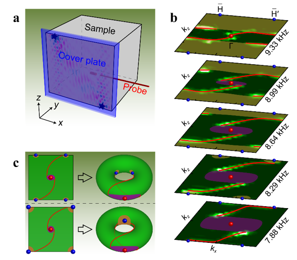 图1:(a)声子晶体中四个不同外尔点的局部放大图,其中Γ点和A点的二重简并点为二次型外尔点,其它为常规外尔点。(b-d)相应的实验证明。