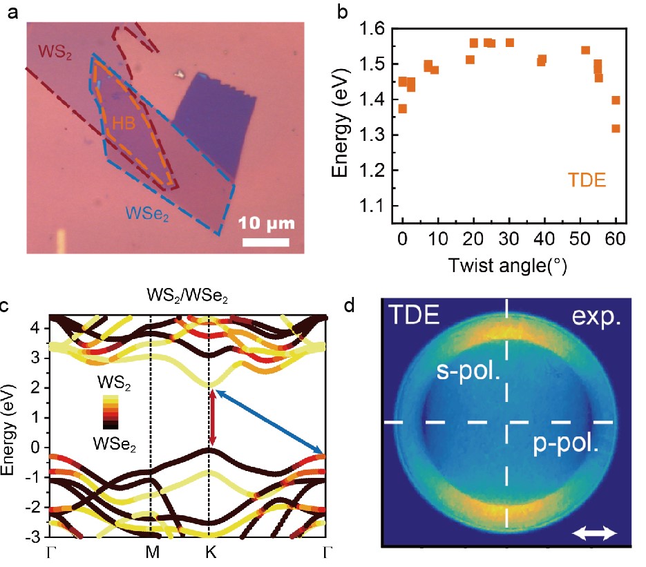 图(a)WS2/WSe2异质结的光学照片。(b)异质结中低能新峰峰位随堆叠角度变化的依赖关系。(c)理论计算的异质结能带结构。(d)动量分辨的新峰荧光成像。