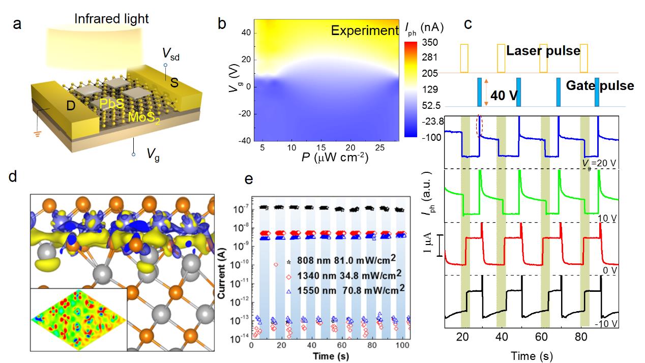 为了克服二维层状材料的这些弊端,并利用非层状硫族窄带隙半导体高效的光吸收性能。何军课题组实现了一种基于MoS2/PbS范德华异质结的红外非易失性存储器。光生电子空穴空间分离,该器件有效阻止了光生电子空穴的复合,极大的提高了光电导增益。该器件展现出了极高的红外光探测性能:光响应度超过107安培每瓦,光增益超过1011,探测率超过1015琼斯,而且具有极其稳定的光存储性能,存储时间超过104秒。此外该存储器可以通过脉冲栅压擦除,经过2000次循环仍能保持稳定。结合理论模型与实验数据,我们发现光存储机制来源于PbS中光生电子注入MoS2,界面势垒ФR阻止MoS2里面的电子反向注入PbS。光生空穴被局域在PbS中引起光栅效应,诱导的电子浓度大约2.4×1024cm-3, 出现光存储现象。通过脉冲栅压MoS2电子浓度增加,MoS2中电子通过量子遂穿注入PbS与局域空穴复合,光存储被擦除。这项研究成果为光电子存储以及其逻辑电路提供了新思路,相关研究成果以“Nonvolatile infrared memory in MoS2/PbS van der Waals heterostructures”为题发表在science advances(Sci.Adv.2018;4:eaap7916)上。