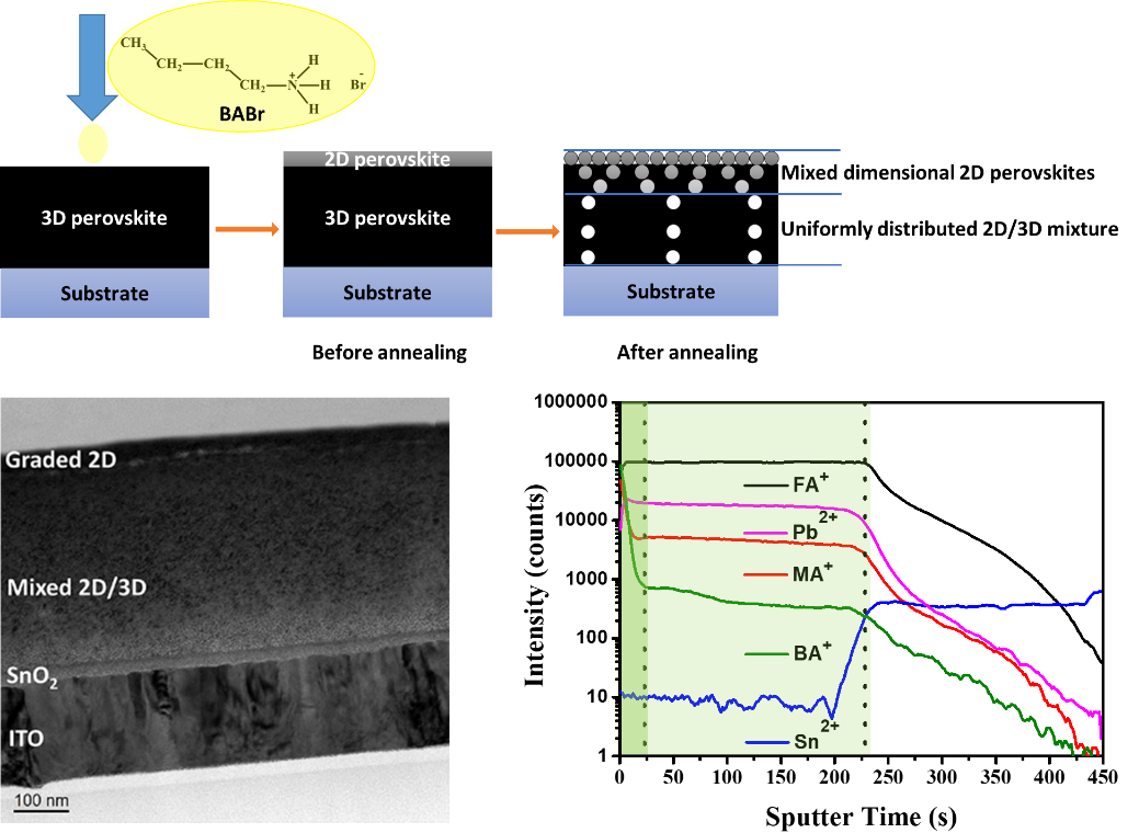 这项工作通过采用丁胺分子对三维钙钛矿表面的处理,一方面在三维钙钛矿表面形成了梯度能级分布的二维钙钛矿表面钝化层;同时丁胺分子在热动力学的驱动下自上而下扩散,在钙钛矿薄膜内的晶界处形成了二维/三维钙钛矿的本体异质结。从而有效降低了三维钙钛矿薄膜薄膜的面缺陷和体缺陷浓度。 这种表面和体内的协同钝化策略有效地降低了不同带隙宽度钙钛矿薄膜中的非辐射复合损失。 在1.63eV带隙的钙钛矿电池中获得了1.24V的VOC。在1.53eV带隙的钙钛矿中获得了23.78%的效率,VOC高达1.21V,第三方认证机构的测试效率为23.09%。该协同钝化减少开路电压损失策略被证明同样适合于带隙宽度为1.56eV和1.73eV的钙钛矿。同时,由于二维钙钛矿具有良好的环境稳定性,基于这种方法制备的二维/三维钙钛矿电池,其稳定性也得到了显著提高。
