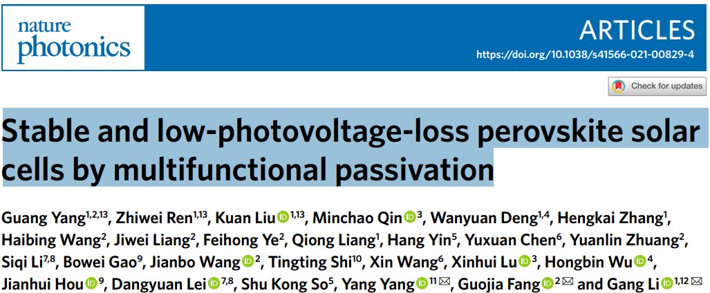近期Nature Photonics《自然•光子学》在线发表了武汉大学与香港理工大学以及加州大学洛杉矶分校的合作研究成果。论文题为“Stable and low-photovoltage-loss perovskite solar cells by multifunctional passivation”(《多功能钝化实现稳定、低开路电压损失的钙钛矿太阳能电池》)。