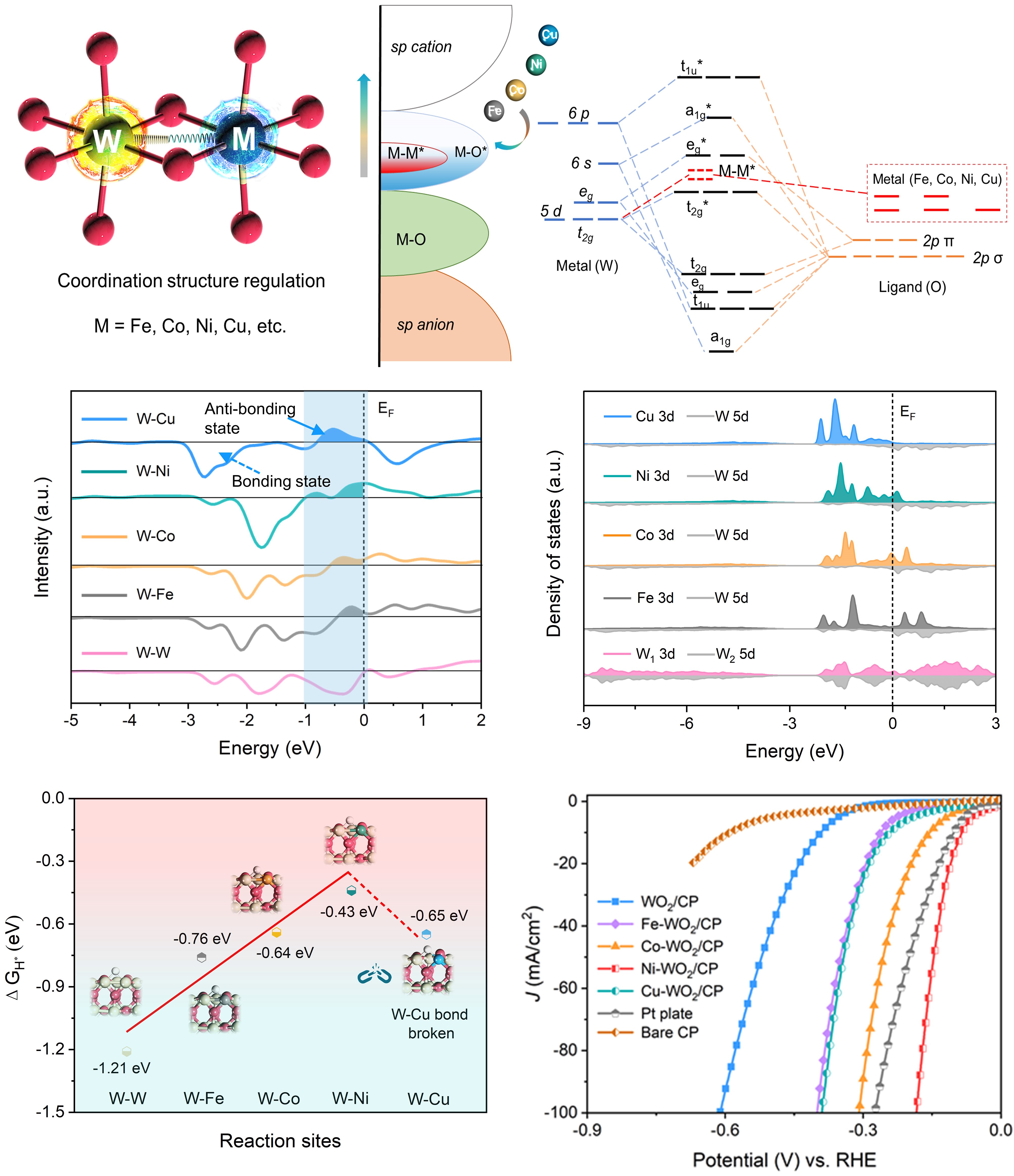 基于此,研究团队以具有金属性的WO2作为模型材料,系统研究了金属与金属原子之间d-d轨道相互作用本质并且提出了金属-金属轨道耦合调控策略。理论计算以及实验研究发现通过调控双八面体中反键轨道中的电子填充度可以有效地调节金属-金属键的强度,实验上使用具有更高d带电子填充的M杂原子(M = Fe、Co、Ni、Cu等)取代W原子可以梯度削弱W-M键从而实现其d-d轨道配位结构的精细调控。进一步我们将该类材料推广应用于电催化析氢催化剂应用,发现梯度调控的W-M配位结构可以有效调节材料表面氢吸附/脱附行为及反应活性。实验测试发现Ni-WO2在众多的M-WO2催化剂中表现出最佳的催化活性。其在-10 mA/cm2的电流密度下所需过电位仅为41 mV,并且在超过100小时的稳定性测试中表现出优异的性能保持性,代表了迄今为止最佳的钨基析氢催化剂之一。此外,这种基于金属氧化物中金属-金属轨道耦合调控的策略可以为其他过渡金属氧化物微观配位的精细调控和相关应用设计提供有价值的见解和参考意义。