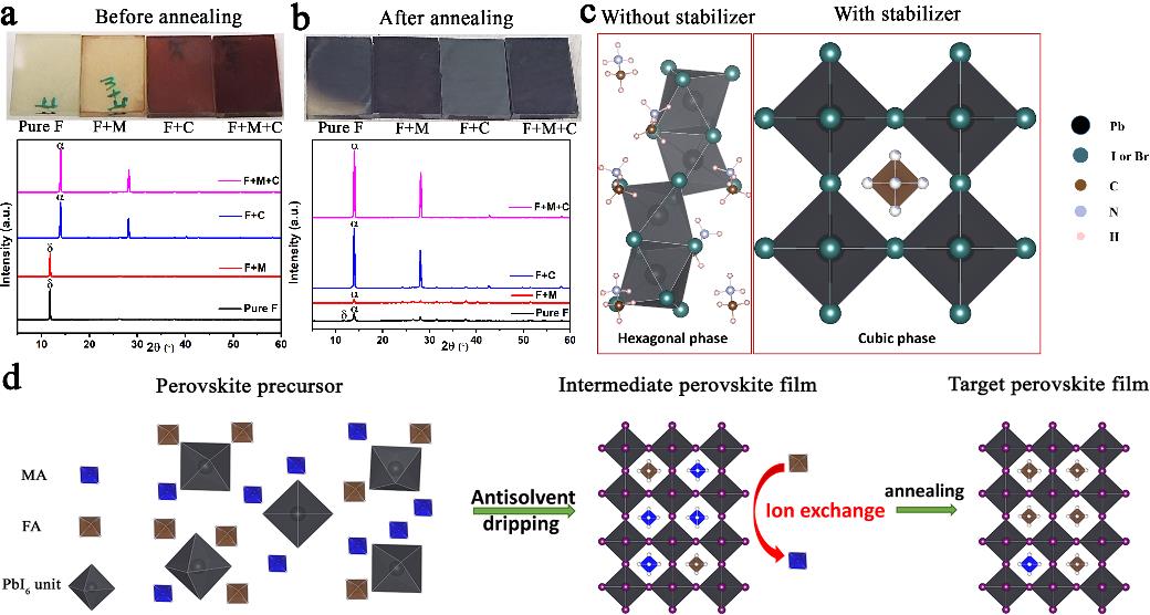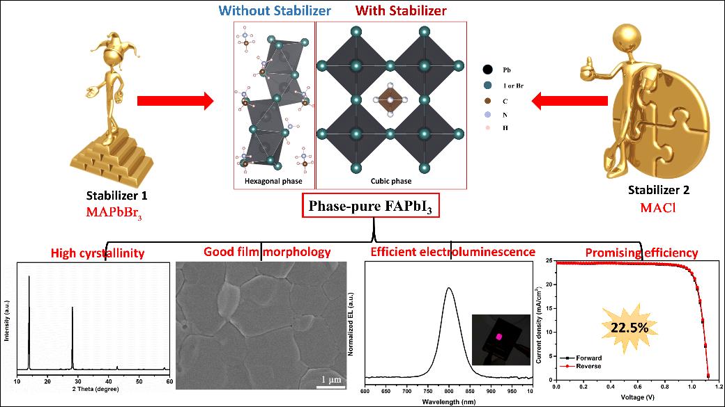 近期,我院方国家教授课题组和香港理工大学李刚教授课题组合作,开发了一种稳定剂辅助生长高质量钙钛矿薄膜的方法,并显著提高了相应钙钛矿电池的光电性能和稳定性。甲脒铅碘(FAPbI3)基钙钛矿具有理想的光学带隙,根据Shockley-Queisser效率极限,FAPbI3钙钛矿太阳能电池具有更高的理论光电转换效率。但FAPbI3材料的相稳定性和长期稳定性都比较差,因此很难制备高效、稳定的FAPbI3基钙钛矿电池。