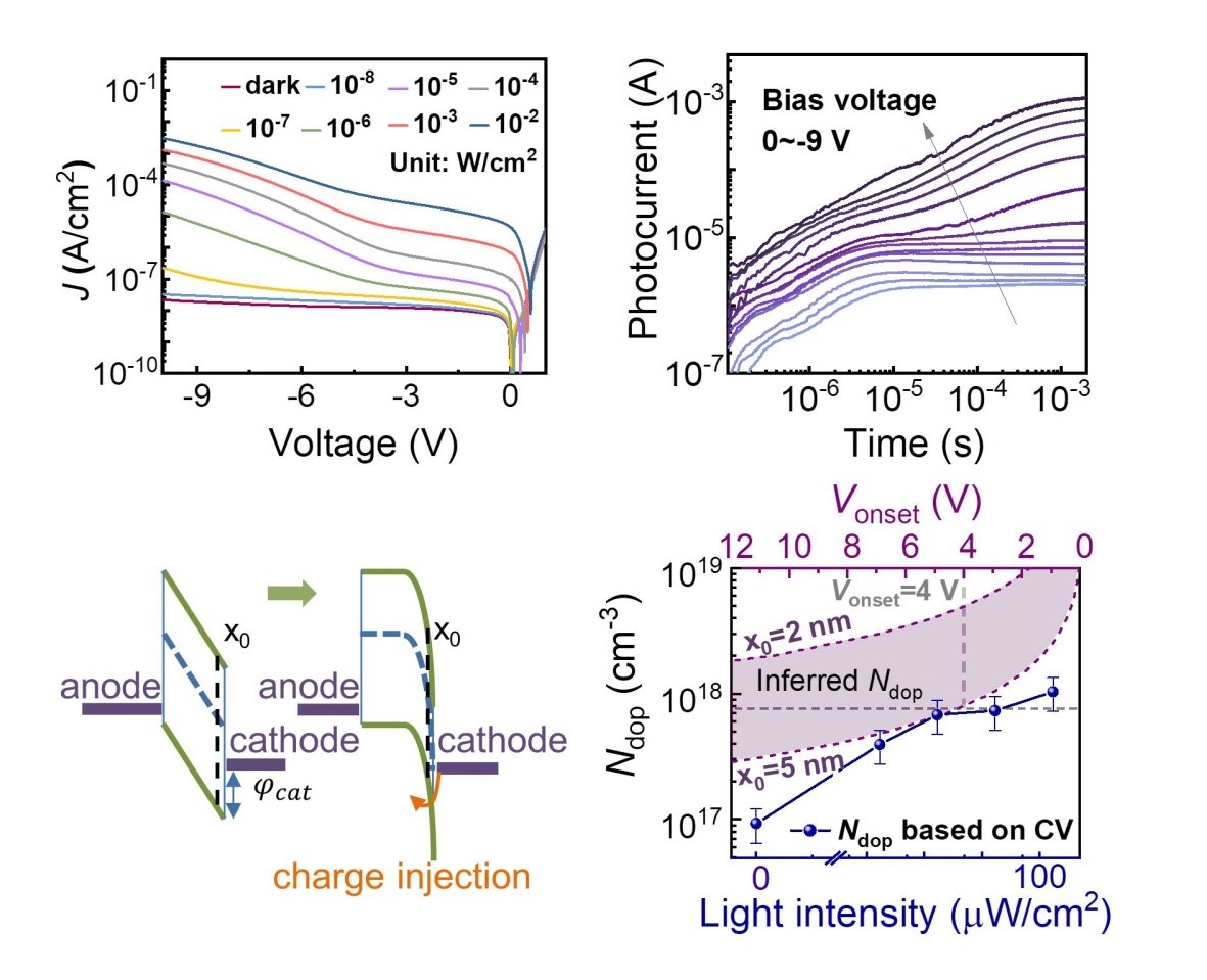 为了解决上述问题,研究团队通过界面修饰和有源层成分调制,优化了器件性能,在反向偏置电压高达-10 V的情况下实现了超低而平坦的暗电流,在-10 V反向偏置电压下的响应度达到23.6 A/W,比探测率达到1.04x1012 Jones。更重要的是,研究团队基于多种瞬态技术,揭示了器件的基本工作机理:光电导增益效应是一个缓慢的过程,依赖于载流子隧穿和积累所产生的光诱导肖特基效应。