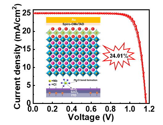 传统的外部封装技术作为一种直接的工艺手段,可一定程度地阻隔空气中的水氧从而提高钙钛矿电池的环境稳定性。然而由电池内部的缺陷、离子迁移和扩散导致的不可逆光降解是传统外部封装所不能解决的。因此本文提出了一种具有双界面修饰的内封装策略,全方位地钝化缺陷和减少离子迁移通道来抑制碘离子迁移。即一方面在二氧化锡电子传输层表面旋涂一层氯化铌然后低温退火形成含氯的五氧化二铌。含氯的五氧化二铌不仅能为钙钛矿吸光层与二氧化锡电子传输层提供一个更好的能级阶梯结构;同时氯能与钙钛矿下界面未配位的铅相互作用成键,钝化钙钛矿下界面缺陷形成更贯穿更大的钙钛矿晶粒;还可以减少钙钛矿体相和表面的残余碘化铅,从而实现钙钛矿的底层封装。另一方面再在钙钛矿表面旋涂一层正丁基溴化铵形成二维钙钛矿,进一步减少表面缺陷和残余碘化铅,从而同时实现对钙钛矿的顶层封装。通过器件优化,最终获得24%的光电转换效率,同时器件在经过1000小时最大功率跟踪测试(55温度下持续光照)后仍能保持88%的初始效率。