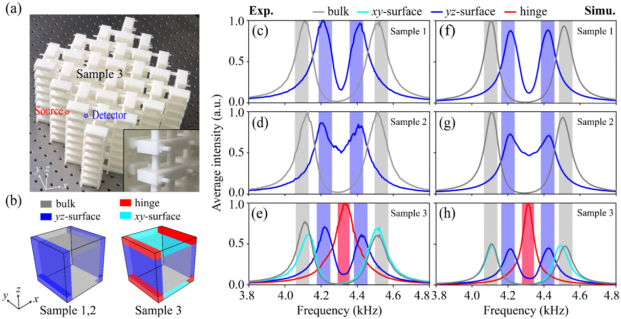 2三维“面阻碍”高阶拓扑绝缘体的声学实现。(a)实验样品;(b)体、面、棱态的空间分布示意图;(c-e)各空间区域上实验测量的强度谱线,显示“面阻碍”拓扑的完整证据;(f-h)相应数值模拟结果。