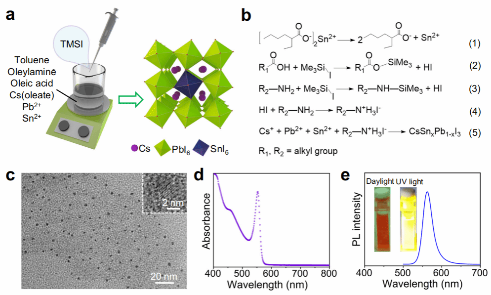 该工作开创了纯碘全无机锡-铅混合钙钛矿量子点在室温环境中的可控合成,丰富了该类钙钛矿量子点的合成途径,填补了相关研究的空白。