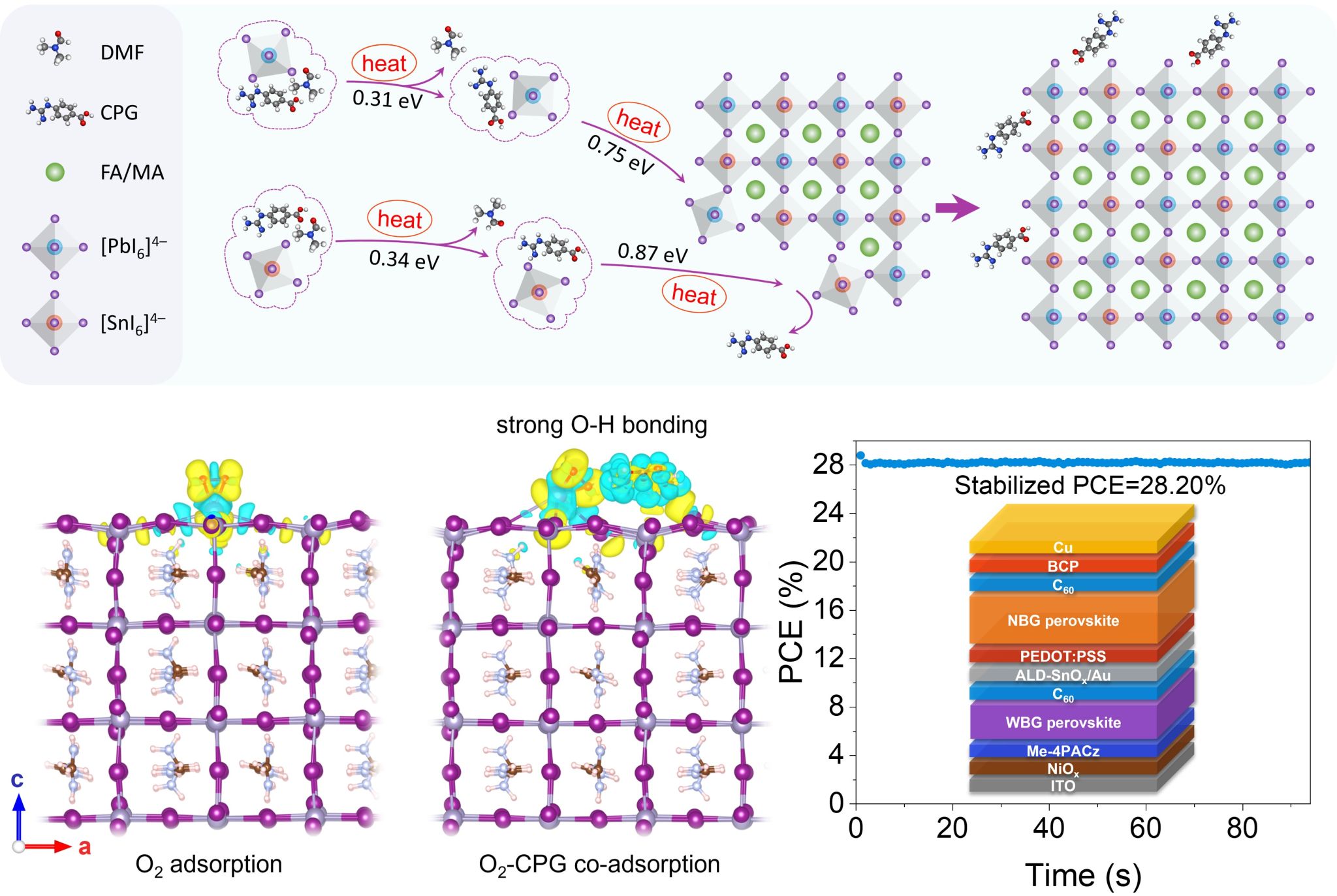 窄带隙锡铅混合钙钛矿是全钙钛矿叠层电池的主要组成部分。然而,锡铅混合钙钛矿始终面临着两大主要难题,即二价锡离子的氧化问题和锡基钙钛矿与铅基钙钛矿之间的结晶不平衡问题。基于此,作者提出了一种分子掺杂的策略,通过分子间相互作用构建了中间相,平衡了锡铅混合钙钛矿的结晶过程,提升了晶体质量和结晶均匀性。同时,该策略还可为二价锡离子的氧化构筑势垒,抑制氧分子在晶体表面的吸附,大幅减轻二价锡离子的氧化。此外,该策略还能显著降低晶体的缺陷态密度,抑制载流子的非辐射复合。得益于以上过程,单结窄带隙锡铅钙钛矿太阳能电池的光电转换效率超过了23%,两端全钙钛矿叠层太阳能电池实现稳态效率28.2%。论文题目为“Mixed tin-lead perovskites with balanced crystallization and oxidation barrier for all-perovskite tandem solar cells”《具有平衡结晶和氧化屏障的混合锡铅钙钛矿用于全钙钛矿叠层太阳能电池》,博士生周进为论文第一作者,该工作发表在Nature Communications。