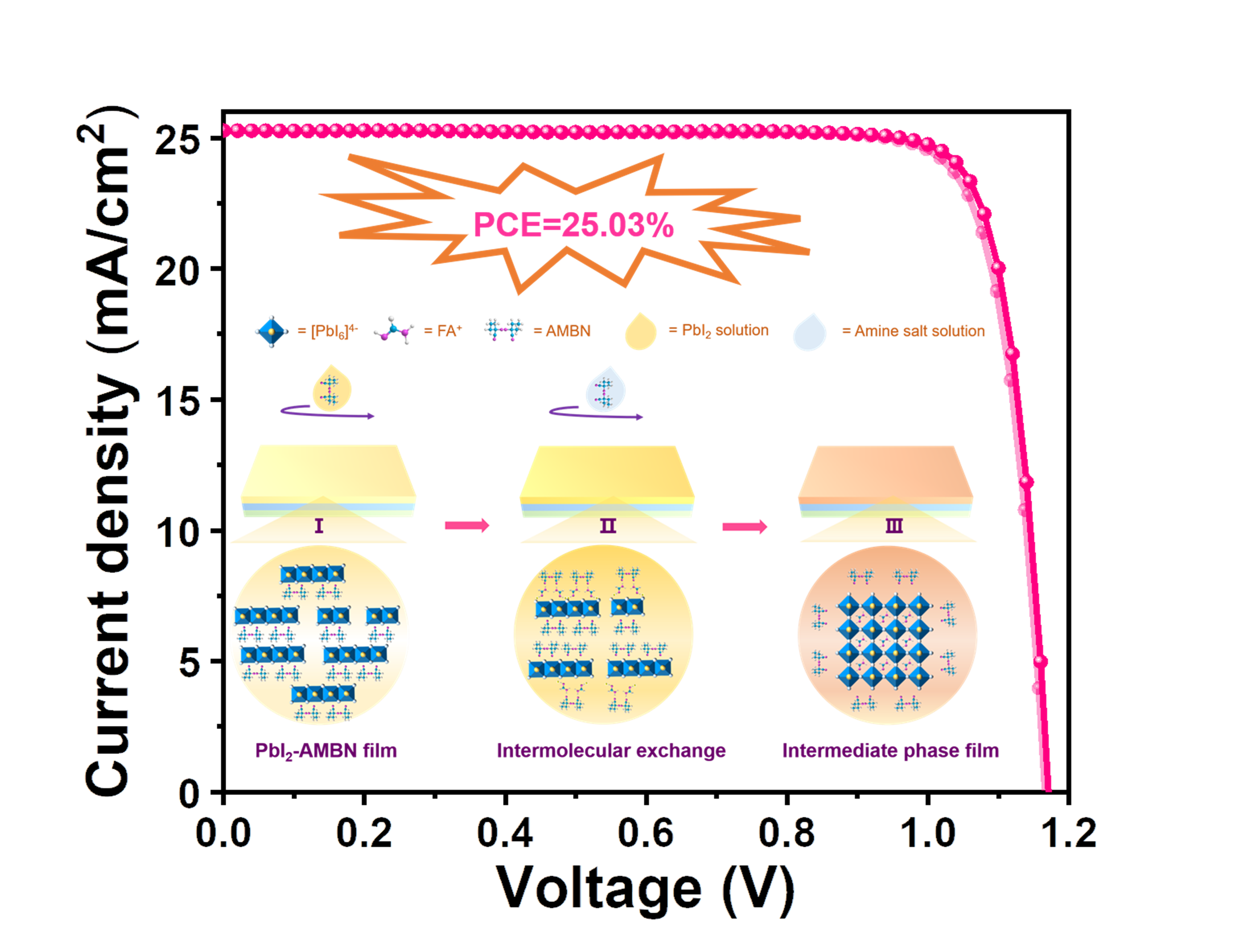 本文报道了一种基于2,2-偶氮二(2-甲基丁腈)(AMBN)配位的独特中间相策略来调控两步法钙钛矿成膜,即在PbI2溶液和铵盐溶液中都引入少量的AMBN。相比已报道的含单一羰基或单一羧基基团的添加剂材料,AMBN具有两个对称的氰基。氰基由于其氮上活跃的孤对电子具有很强的给电子能力,因此在引入到钙钛矿前驱液中可以同时铆钉2个Pb2+形成AMBN与[PbI6]4-的复合物中间相来控制成核;同时经实验证明AMBN还可与FA+由于氢键作用形成AMBN与FAI的复合物来抑制FA+无序的剧烈活动。因此在引入AMBN后,不仅获得了孔径面积比更大的多孔PbI2薄膜,还使得钙钛矿(001)取向的结晶得到增强,并且由于与晶界残余Pb2+和FA+的作用使得钙钛矿薄膜中的缺陷得到有效的抑制。最终使得钙钛矿薄膜的激子寿命得到大幅提升,界面抽取得到改善,复合得到抑制,从而在正置单节结构器件中实现了超过25%的光电转换效率。这一方案为更深入地理解钙钛矿的结晶过程和提高钙钛矿薄膜质量提供了新思路。