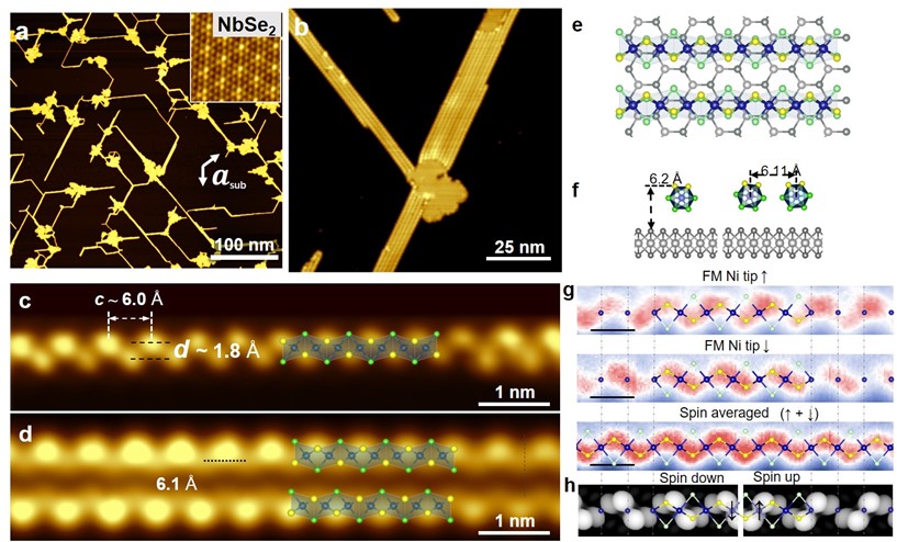 图: 1D 2D CrCl3的扫描隧道显微镜成像;右,1D CrCl3纳米线原子结构模型