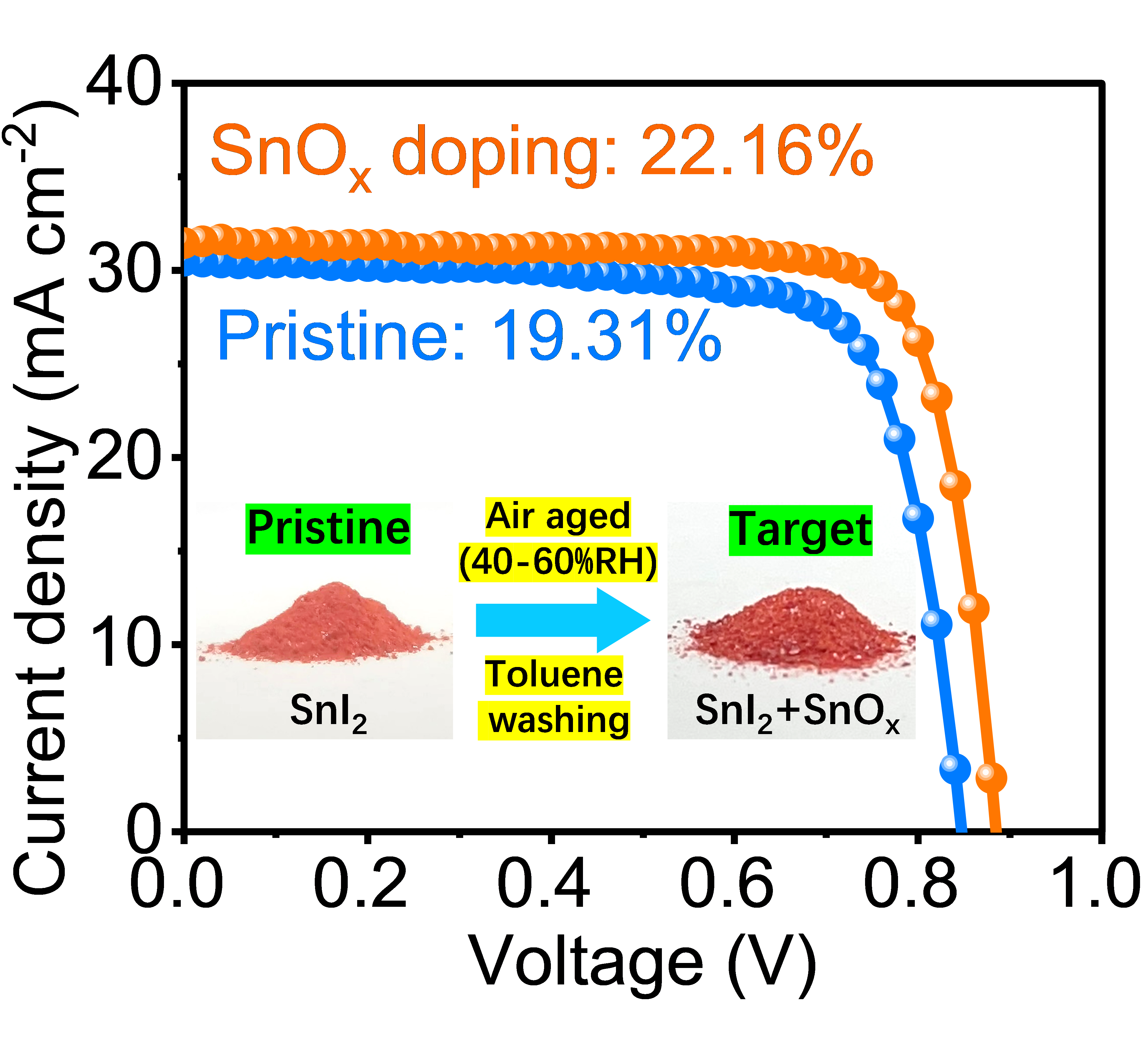 全钙钛矿的窄带隙子电池通常使用锡/铅基(Sn-Pb) 混合的钙钛矿吸光层。Sn-Pb混合钙钛矿需要引入Sn元素才能获得窄带隙,但是其中亚稳态的Sn2+很容易被氧化成Sn4+。这会导致p型自掺杂行为,并且载流子复合严重,从而降低太阳能电池的性能和稳定性,所以是领域内当前的共性挑战问题。基于此,该工作提出了一种简便的自然氧化得到的SnOx掺杂Sn-Pb窄带隙钙钛矿。SnOx掺杂可以使Sn-Pb钙钛矿薄膜的形貌、晶体质量大大改善,并且有效地减少了缺陷。更有趣的是, SnOx 掺杂还能够提高Sn-Pb钙钛矿的费米能级,有利于载流子的输运/提取,从而大大减少载流子的复合。所制备的SnOx掺杂的窄带隙钙钛矿太阳能电池的效率高达22.16%,未封装的SnOx掺杂的窄带隙钙钛矿太阳能电池也具有增强的稳定性,在充满氮气的手套箱中储存2300小时后,其可以保持约100%的初始效率。得益于高效的单结窄带隙钙钛矿太阳能电池,制备的两端全钙钛矿叠层太阳能电池的效率达到26.01%。该工作介绍了一种简单的掺杂策略,用于制造高效率的单结窄带隙钙钛矿及其叠层太阳能电池,为进一步制备效率超过30% 的叠层电池提供了新思路。论文题为“Efficient Narrow-bandgap Mixed Tin-lead Perovskite Solar Cells via Natural Tin Oxide Doping”(《利用自然氧化的氧化锡掺杂制备高效窄带隙锡铅混合钙钛矿太阳能电池》),该工作发表在Advanced Materials上,第一作者为我院科研助理黄立帅。