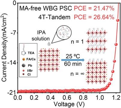 全钙钛矿叠层电池中的宽带隙钙钛矿子电池的性能也非常关键,然而宽带隙钙钛矿电池的大开路电压(VOC)损失和严重的光诱导卤素相分离仍然是阻碍其应用的重要挑战。基于此,该工作提出了一种不经过热退火的后处理策略,在宽带隙钙钛矿上表面形成2-噻吩乙基卤化铵的单相二维钙钛矿(n = 1)表面修饰层。与产生多个二维相的传统热退火方法相比,这种无热退火后处理的方法可以更有效地钝化宽带隙钙钛矿薄膜的缺陷,抑制光诱导的钙钛矿相分离。由此制备的不透明和半透明的1.66 eV 无甲胺基的宽带隙钙钛矿太阳能电池的最大光电转化效率分别为21.47% (0.43 V 的小开路电压损失)19.11%,这两者都是报道的同类电池的最高效率之一。由此制备的四端全钙钛矿叠层电池达到了26.64% 的效率,在高效多结叠层太阳能电池中显示了广阔的应用前景。论文题为“Low-Dimensional 2-thiopheneethylammonium Lead Halide Capping Layer Enables Efficient Single-Junction Methylamine-Free Wide-Bandgap and Tandem Perovskite Solar Cells”(《低维2-噻吩乙基铵卤化铅覆盖层实现高效单结无甲胺宽禁带和叠层钙钛矿太阳能电池》),该工作发表在Advanced Functional Materials 上,第一作者为我院2021级博士生管红令。