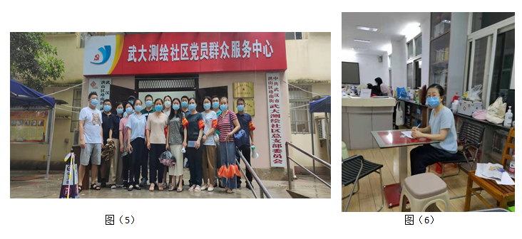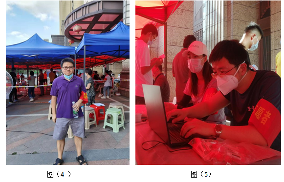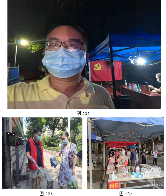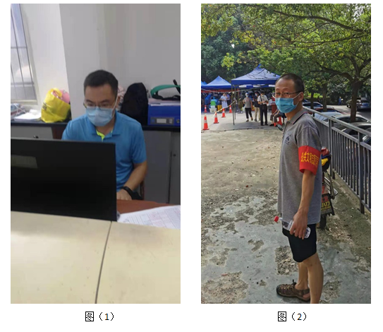 王晓峰同志(图1)看到广八路社区党员下沉群征集电脑高手完成社区信息录入、信息排查以及信息比对工作,结合自己的特长积极响应,尽量做到排查信息不漏一人。刘海林同志(图2)深入老年人活动中心核酸检测现场服务,并为后面的 入户排查核酸检测情况积极贡献力量。周利同志参与了8月5日珞珈雅苑社区核酸检测志愿服务(图3),回顾下沉经历他感叹到“我看到了训练有素的医护队伍和社区工作人员、积极报名的党员志愿者、没有慌乱秩序井然的小区居民,也看到了最终战胜新冠疫情的希望!”支部成员方国家、吴恒毅、尹蕾等都积极参与了社区的下沉服务。郑明飞同志作为武大文理学部九区11栋一门的唯一下沉党员,积极配合社区网格员的工作安排,他认为“对于下沉党员来说,这不仅是一场体验和感悟,更是一种强化责任担当的初心和使命!”