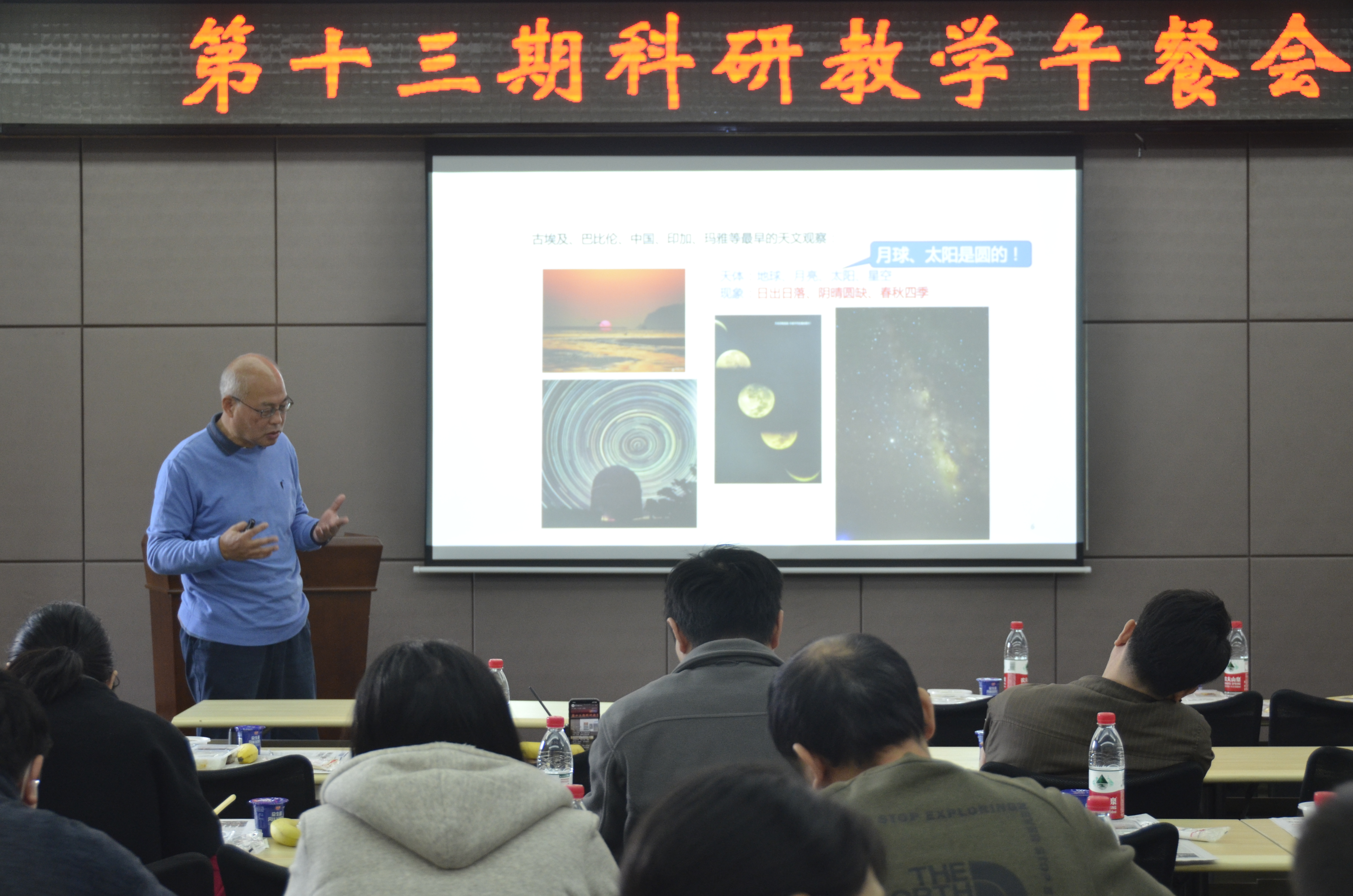 11月17日中午,由学院教师第一党支部牵头开展的“党建+科研教学午餐会”系列活动(第十三期)在新楼五楼多功能厅成功举办。本次午餐会邀请了学院教授、弘毅学堂院长石兢老师为主讲人,以宏大又浪漫的天文知识为主题,吸引了近50名教职工前来聆听,还有百余名师生通过线上直播的方式观看了报告。学院党委书记余向红,党委副书记张一飞、方萍,副院长乔豪学、任峰、李利华参加活动,活动由支部书记刘晓泽主持。