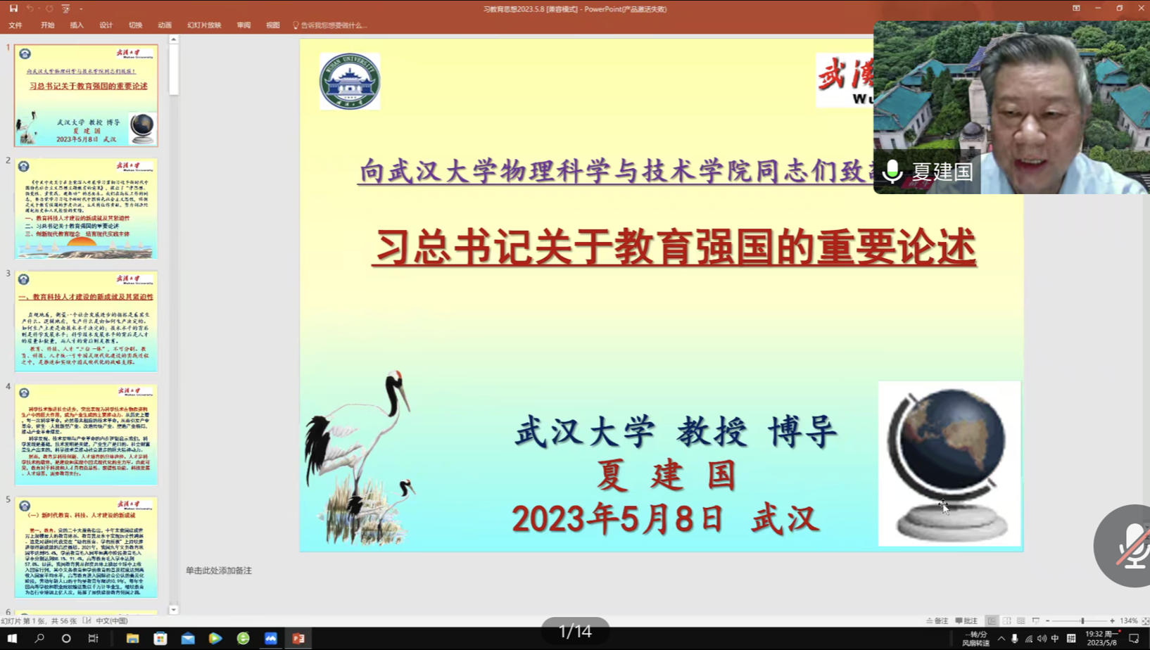 5月8日晚,物理科学与技术学院主题教育读书班(扩大)继续开展学习,邀请武汉大学马克思主义学院夏建国教授作了题为《习近平总书记关于教育强国的重要论述》的专题辅导报告,学院领导班子全体成员和师生党员代表共180余人在线参加学习。报告会由学院党委书记余向红主持。