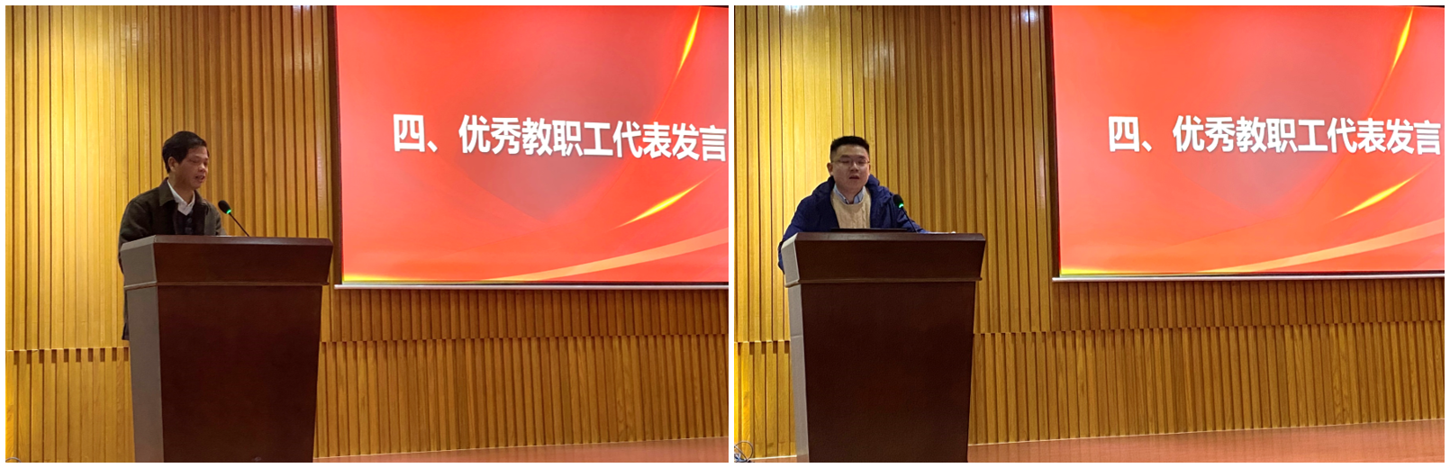 大会第三阶段,为了更好发挥优秀教师的示范带动作用,学院邀请2022年度在教学科研方面表现突出的教师代表吴奕初教授、吴冯成教授进行发言,分享工作心得体会。吴奕初教授带领的物理国家级实验教学示范中心教学团队荣获学校第十四届“杰出教学贡献校长奖”;吴冯成教授获批国家自然科学基金面上项目、科技部重点研发计划课题、湖北省重点研发计划青年项目。