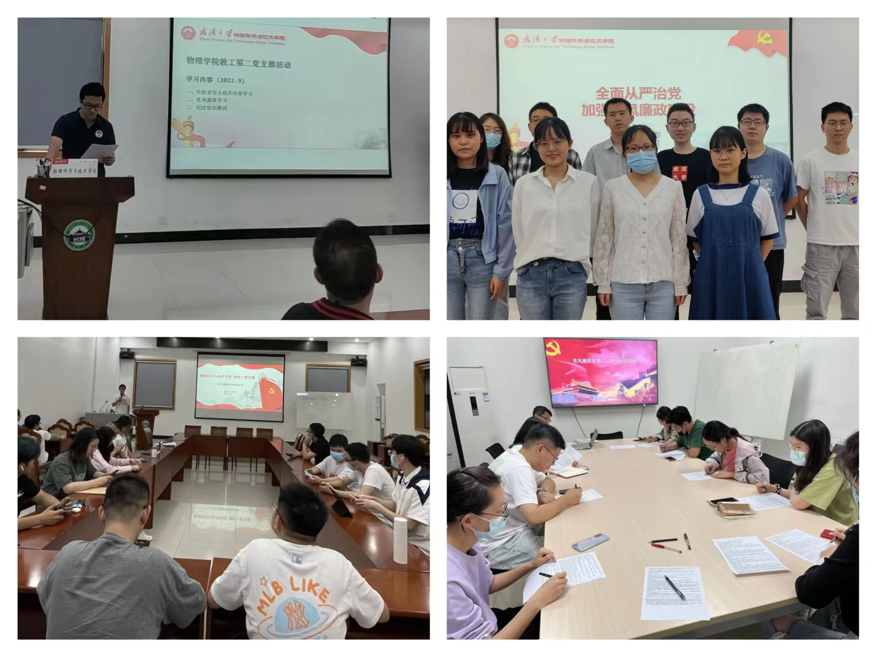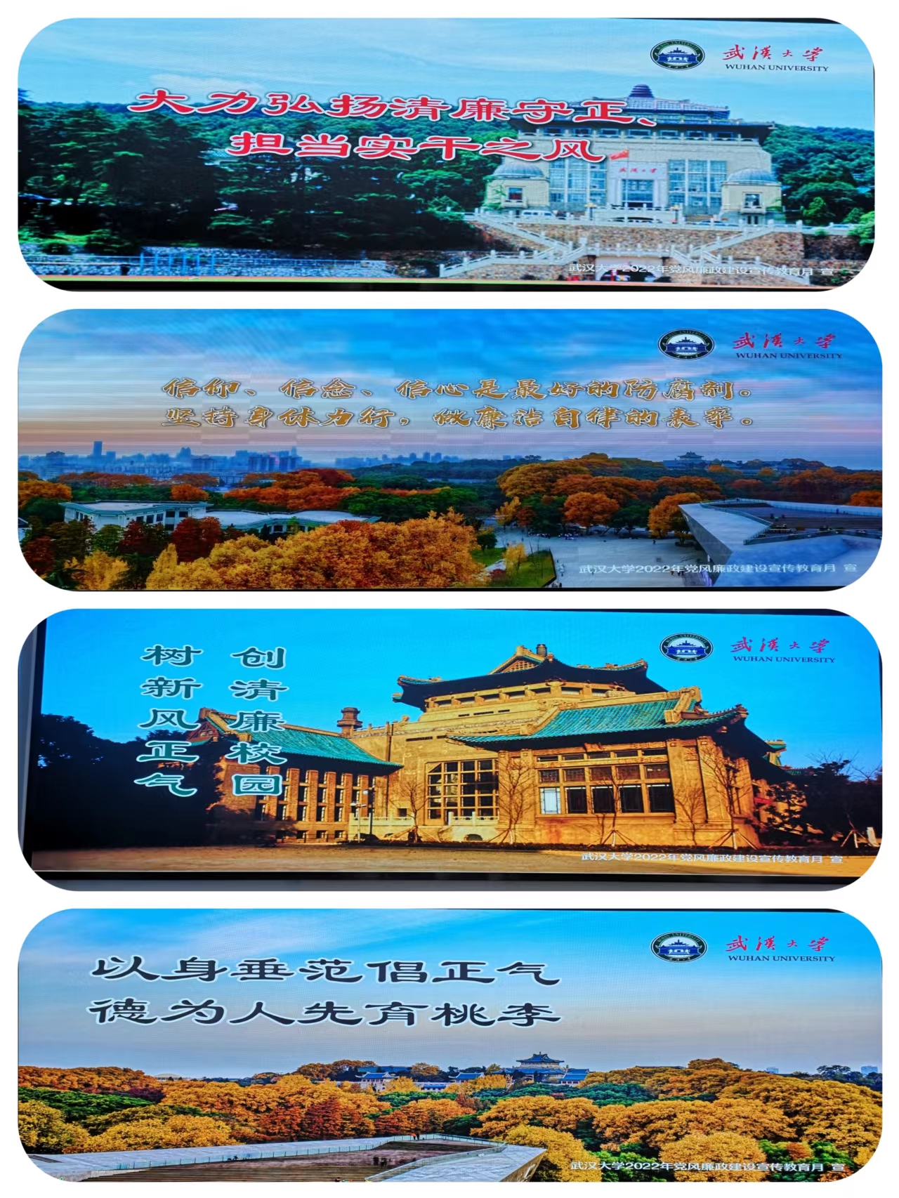 “清廉校园”共建共享。学工办、院团委踊跃开展主题党团日活动,学院本科生党团支部利用校内红色资源,开展新生“徒步珞珈、探访红色印记”红色打卡素质拓展主题活动,针对二年级学生开展二年级计划——学风建设与学业交流主题大会;研究生党支部开展新生入学班会、新生党员见面会、党员迎新志愿者服务、党风党纪知识有奖竞答、“兼辅开讲啦”等系列主题党日活动,将入学教育、安全教育、学风考风教育、诚信教育等有机结合;教工党支部充分利用校内科技资源,开展走访科研公共服务条件平台主题党日活动,贯彻落实习近平总书记考察湖北重要讲话精神,教育全体教职工勇担科技自立自强使命,为科技强国梦想贡献力量。