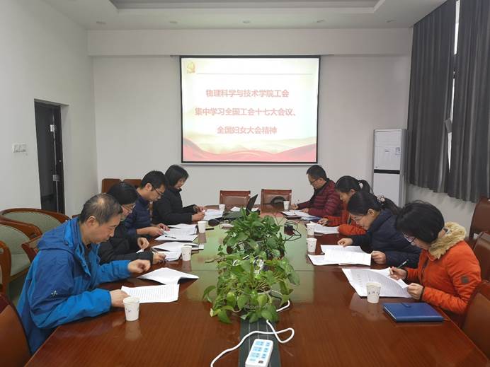 2018年12月24日下午,物理科学与技术学院工会全体委员、工会小组长在院工会主席李利华副院长的带领下集中开展了学习贯彻中国工会十七大、全国妇女代表大会精神。会上大家纷纷畅谈学习体会,结合党的十七大精神讨论并制定了的我院工会在下一步工作的实施方案:
