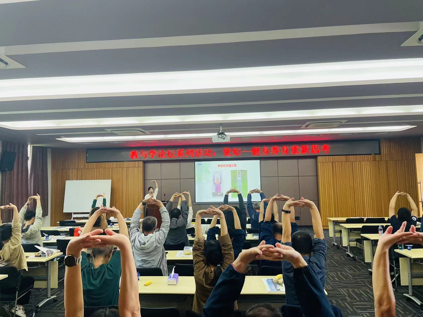2023年10月11日中午,继心理健康系列讲座之后,物理学院教发中心与工会联合第一党支部就教职工们当下比较关心的健康管理问题举办了 “觉知——健身、养生的重新思考”健康管理讲座,本次讲座吸引了院内外的50多名教职工参加。