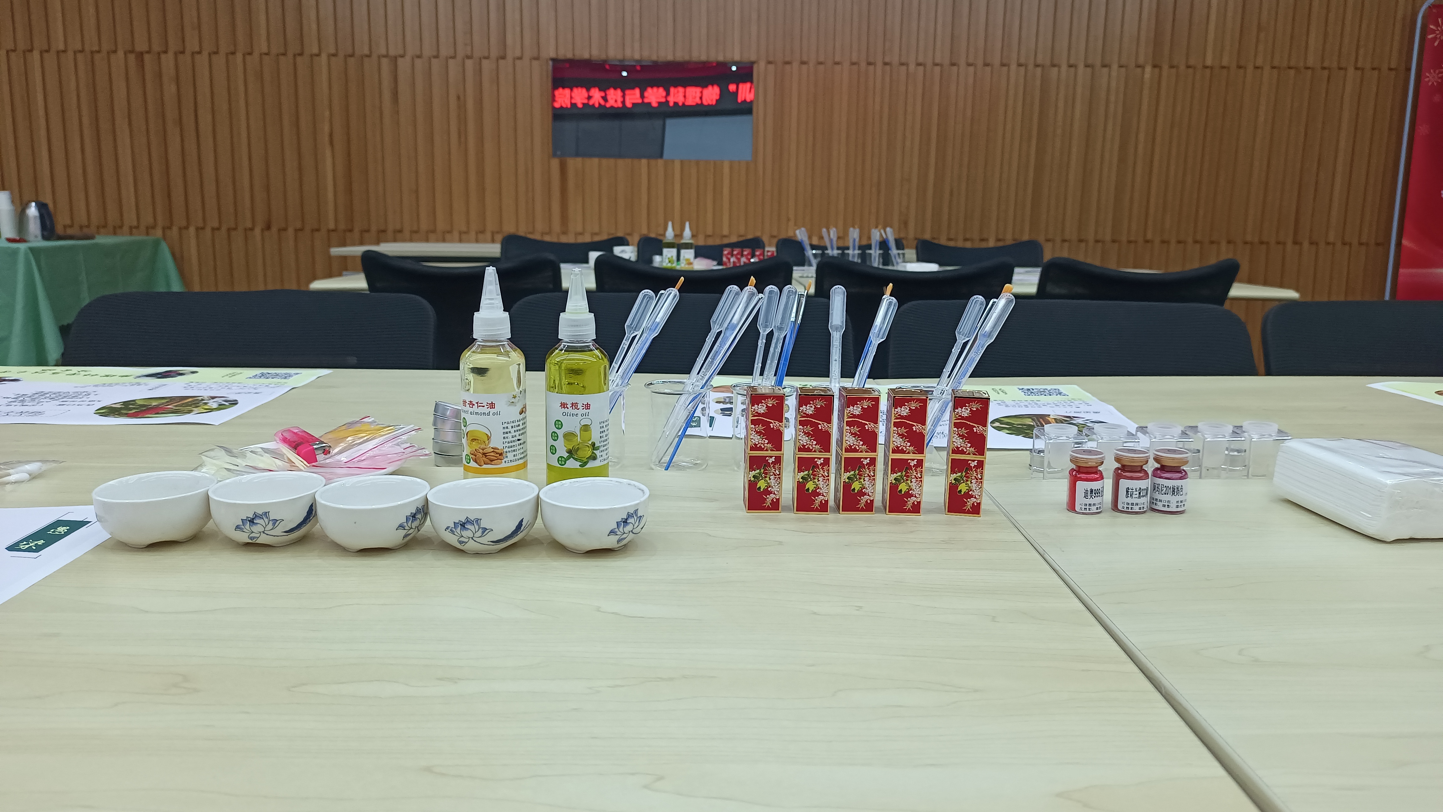 本次活动特邀请了“故宫口红”制作专业老师及助理们现场对大家进行一一指导,同时学院工会配合学校准备了50多份精致、原生态的口红制作材料和道具,大家可以根据自己的喜好和创意,个性化定制口红的色泽、香味等。活动中,老师先通过PPT向大家讲解了口红制作的历史渊源、传统工艺和制作过程,亲自示范了制作方法,并把“故宫口红”秘方分享给大家。随后大家在老师的指导下,亲手配色、研磨、加热、灌模、倒模,一步步完成口红的制作过程,感受传统工艺的魅力。随着一个个色泽饱满、花纹精美且香味盈鼻的口红的完成,大家的成就感也不由而生。活动现场,大家一边学习一边分享交流,处处充满欢声笑语。