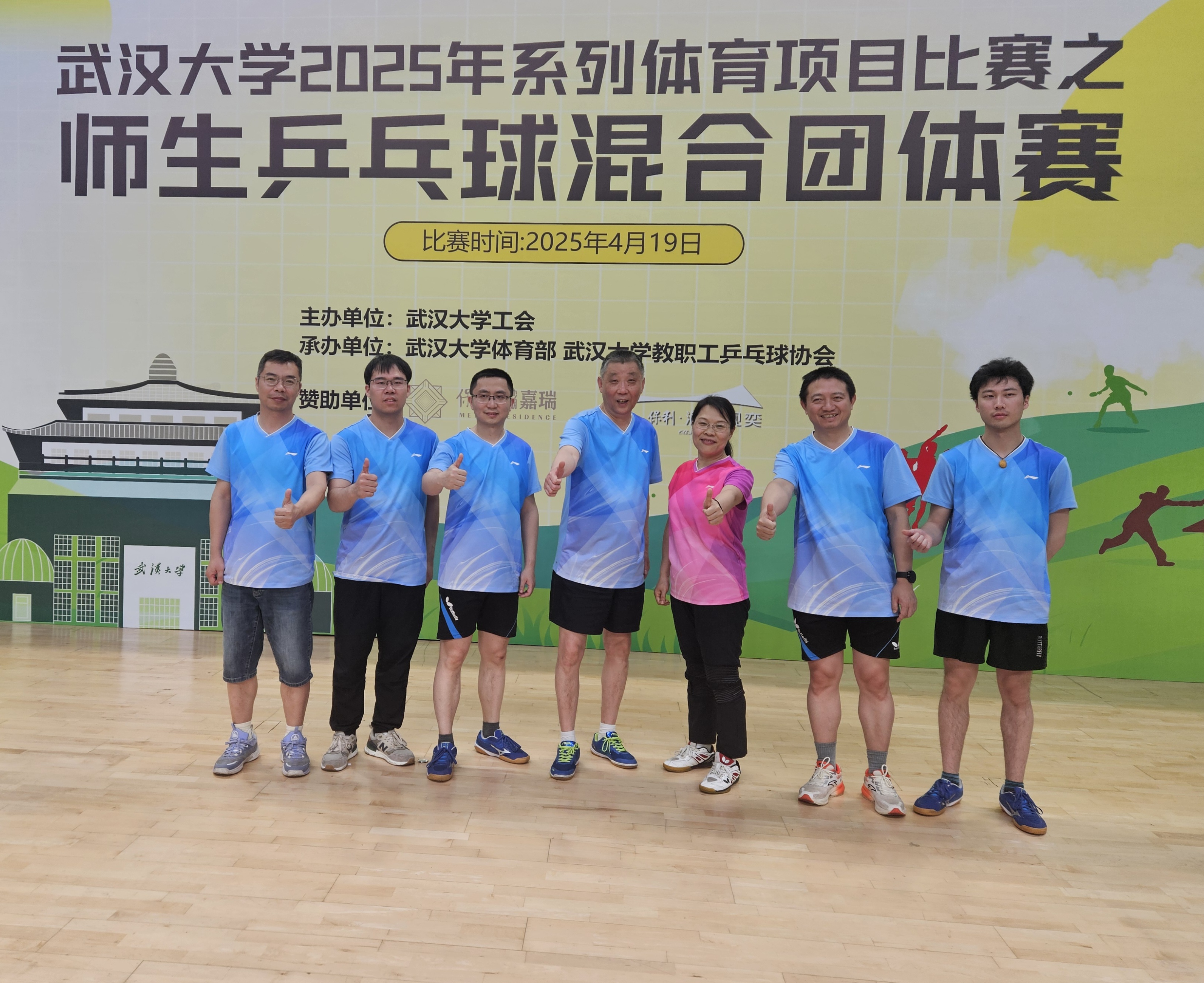 2025年4月19日,武汉大学师生乒乓球赛在卓尔体育馆圆满落幕。经过激烈角逐,物理学院师生联队奋勇拼搏,最终在竞争最为激烈的甲级组比赛中脱颖而出,荣获并列第五名的优异成绩。