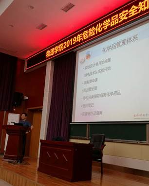 4月25日上午,学院邀请化学与分子科学学院黄驰教授面向全院研究生进行2019年危险化学品安全知识专题培训。此次培训是进一步增加我院学生危险化学品安全知识储备、增强各实验室危险化学品安全防护意识、推动各实验室落实危险化学品规范化管理的重要举措。学院党委副书记张一飞、副院长李利华出席培训活动。
