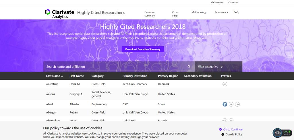 据悉,科睿唯安是全球专业信息与分析服务的领导者,“高被引科学家”名单由基于超过33000本期刊所发表的论文数量和引文数据制定的科研绩效度量指标和科学发展趋势数据得出。本次公布的全球高被引科学家覆盖了包括化学、工程学、材料科学、计算机科学等共21个自然科学与社会科学领域以及跨学科领域,共6000多(人次)高被引科学家入选。美国高被引科学家数量遥遥领先,达2,639人次;英国546人次。中国大陆入榜人数达482人次,另中国香港入榜50人次,中国澳门5人次,中国台湾20人次。徐红星院士曾在2014到2017年度连续入选高被引学者。