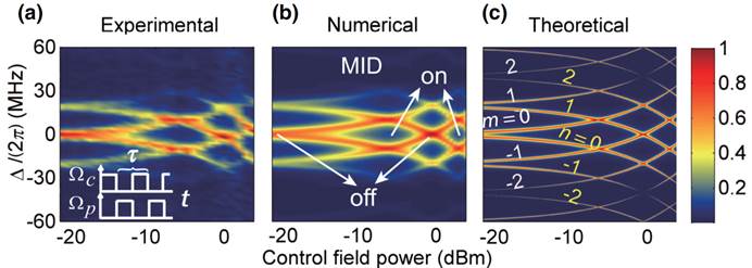 上图(a)是互补调制的时间域光栅,即在同一时刻只有一束微波与三能级超导体系作用。在互补调制下,光栅呈现出光谱汇聚的现象,即时间域光栅衍射光谱的中央明条纹(3-5条)。通过增加探测光的强度我们可以看到更多的衍射和干涉条纹。本工作中,我们的解析和数值结果与实验结果都符合得很好。