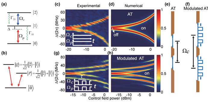 在上图(a)中,两束微波与一个三能级超导量子系统相互作用。通过调节两束微波的参数,可以很容易实现量子光学中著名的Autler-Townes(AT)劈裂现象,如图(c)。这种能级劈裂现象类似于空间域的一束光通过两个反向运动的窗口,如图(e)。受到这种想法的启发,我们设计了如图(g)中时间上同步的周期性调制方案,类似于分别在两个反向运动的窗口中放置光栅,如图(f)。该周期性调制是在时间域,实验中观察到了如图(g)所示的两个光栅在频率域的干涉和衍射光谱。