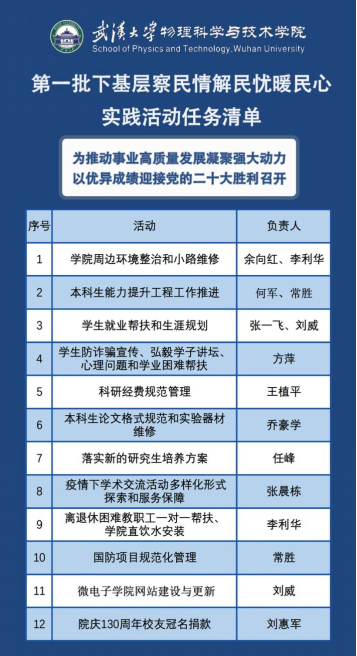 经过党委委员充分讨论,在6月上旬启动物理科学与技术学院第一批服务师生的任务清单,包括了12项具体任务,根据任务完成情况,会陆续发布第一批任务落实的效果清单。后期结合师生需求和调研情况,根据后期师生反映的问题清单,开启第二批服务师生的任务清单。快来了解一下吧!