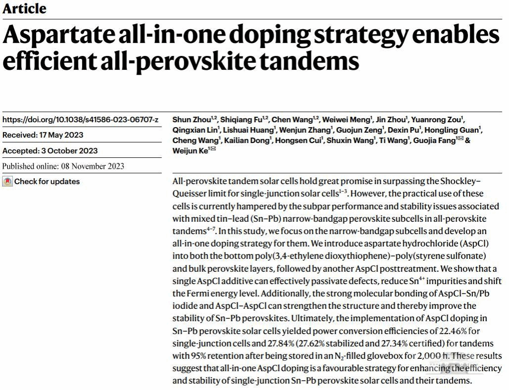 北京时间11月9日凌晨,Nature(《自然》)在线发表了武汉大学物理科学与技术学院柯维俊、方国家教授团队关于全钙钛矿叠层太阳能电池的最新研究成果。论文题目为“Aspartate all-in-one doping strategy enables efficient all-perovskite tandems”(《天冬氨酸盐一体化掺杂策略实现高效全钙钛矿叠层电池》)。