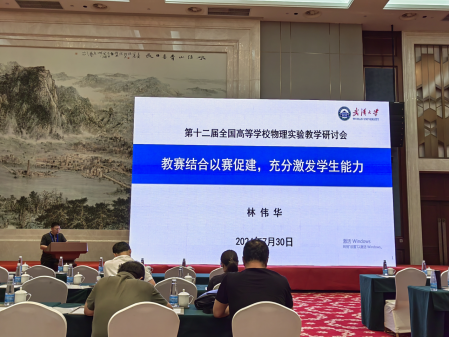 会上,武汉大学物理科学与技术学院国家级实验教学示范中心副主任林伟华总结了实验中心近年来在物理实验教学改革、学生培养方面的经验,做了“教赛结合以赛促建,充分激发学生能力”为题的分会报告。武汉大学物理科学与技术学院国家级实验教学示范中心历年来高度重视物理实验教学改革与创新,建立了以学生为中心的开放实验教学模式,以创新能力培养为目标的实验教学改革探索与实践,在会议中得到了同行的广泛认可和赞扬。