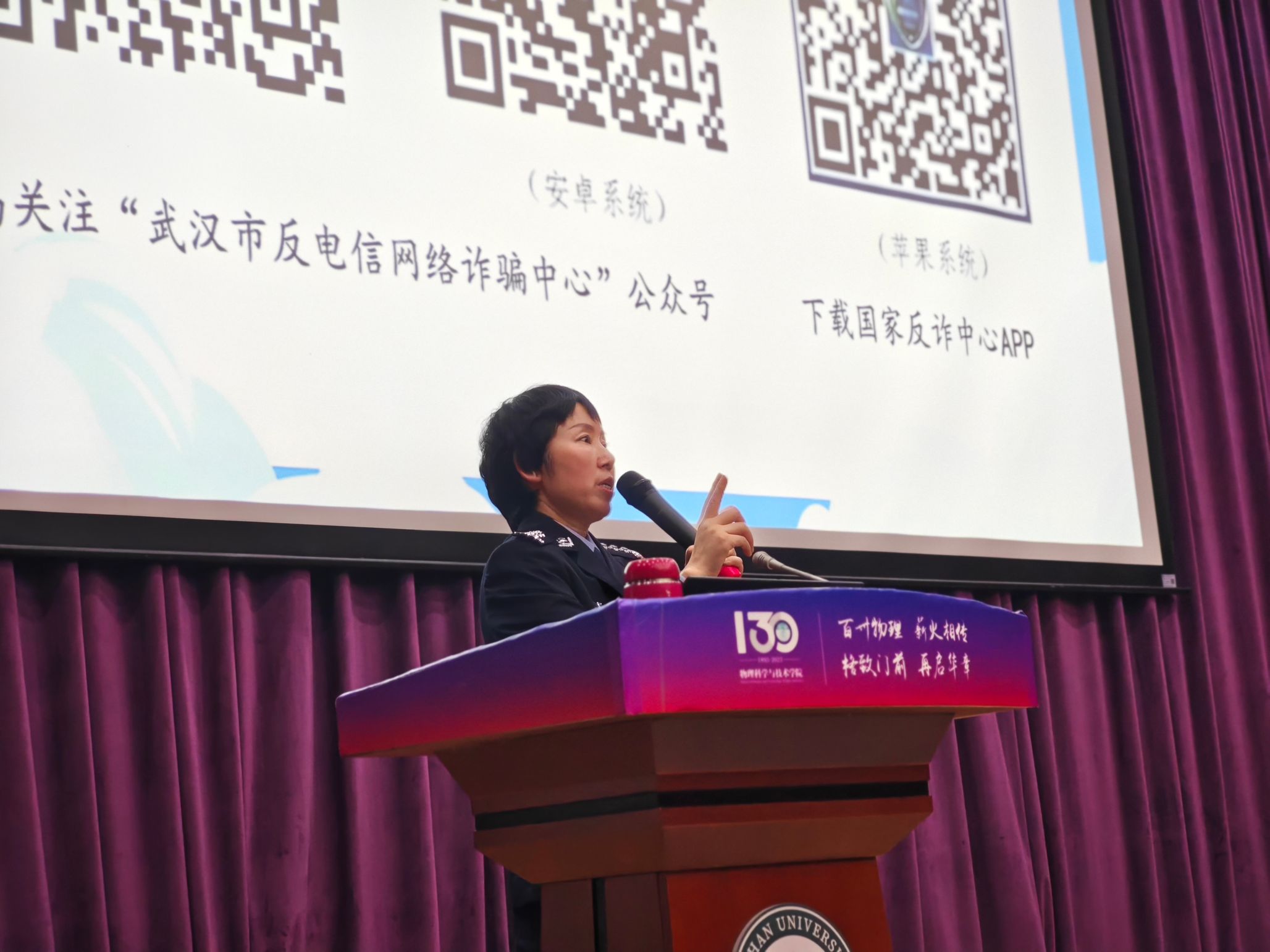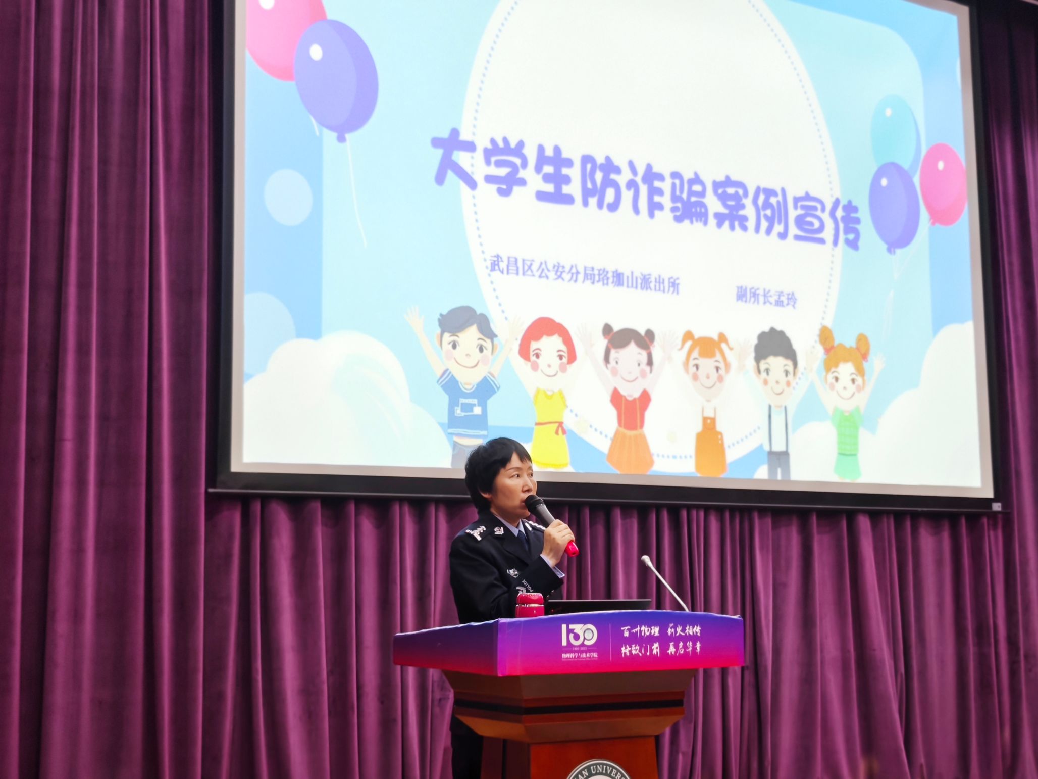 为推动平安校园、法治校园建设,积极引导大学生树立安全观念,增强识别和防范诈骗能力,提高自我保护意识,2024年10月23日晚19:00,物理科学与技术学院安全教育专题讲座在物理学院B101报告厅圆满举行,本次活动邀请武昌区公安分局珞珈山派出所副所长孟玲作大学生防诈骗安全主题报告,聚焦电信诈骗、校园安全教育等多个方面,全面引导学生辨别大学生活中可能遇到的各类诈骗案例。讲座由本科生辅导员彭瑾老师主持,2024级全体新生、各年级学生代表参与活动。