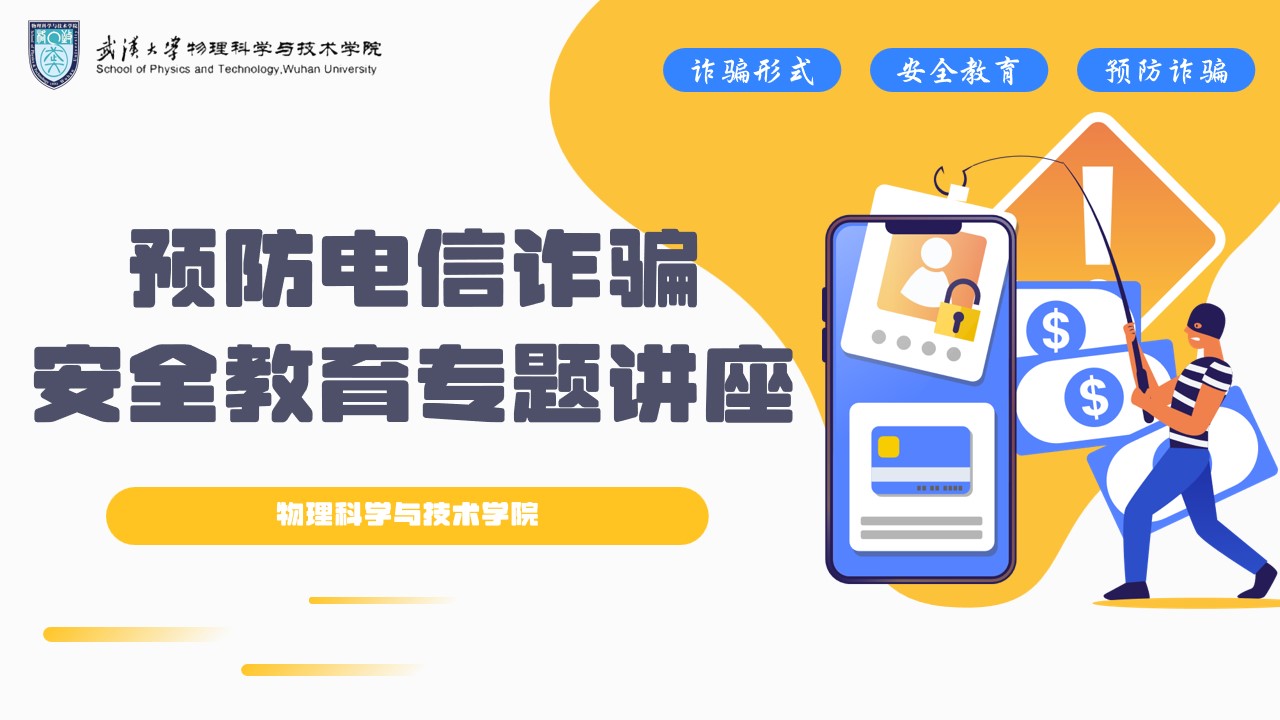 共筑防线,安全护航。通过这次安全教育专题讲座,武汉大学物理科学与技术学院的同学们对各类诈骗手段有了更深刻的认知,提升了自我保护意识和反诈应对能力,学会科学防范各类安全风险。学院将继续致力于构建安全校园,激励同学们以积极的态度面对校园生活中的安全挑战,为构建和谐、安全、健康的校园环境贡献力量。(通讯员:彭瑾)