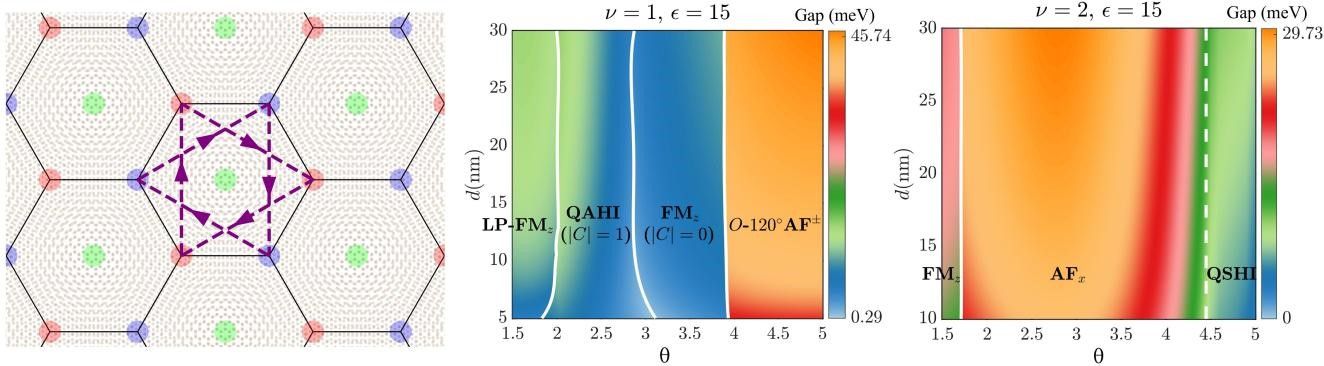 转角双层MoTe2中的三轨道模型(左图);多体相互作用下,空穴填充数为1(中图)和2(右图)的量子相图。