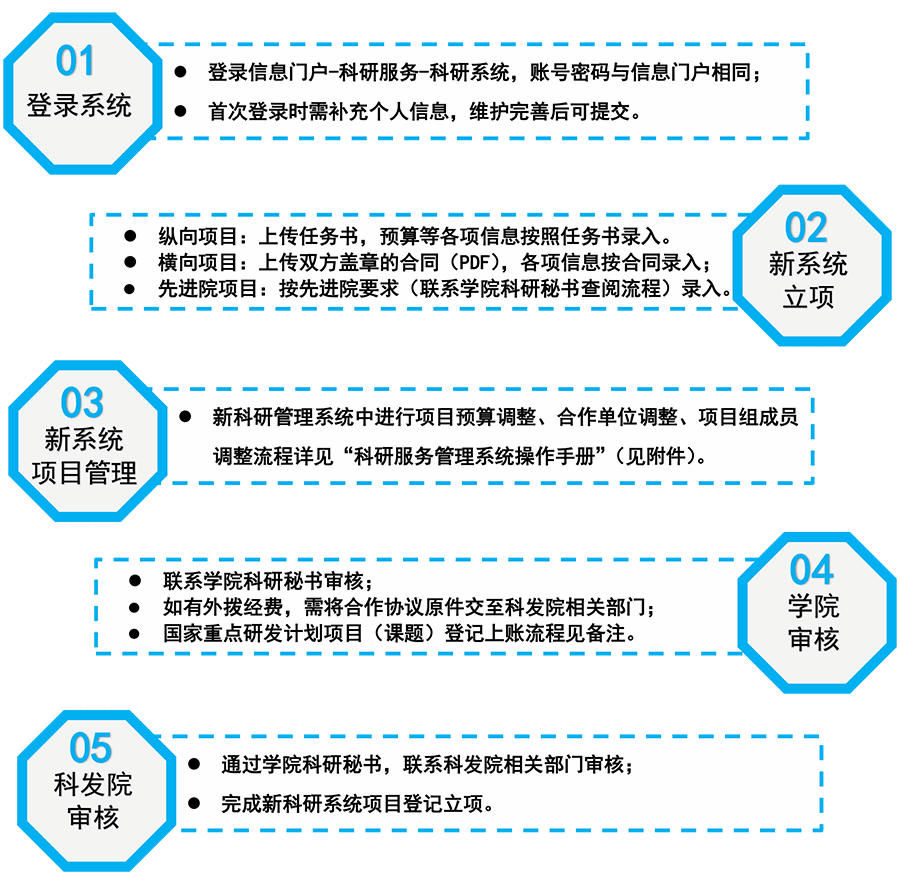 导语:新科研管理系统人员信息审核、横向合同登记(立项)、纵向项目立项、先进院项目立项、合作单位调整、项目组成员调整。
