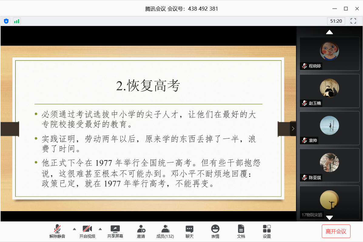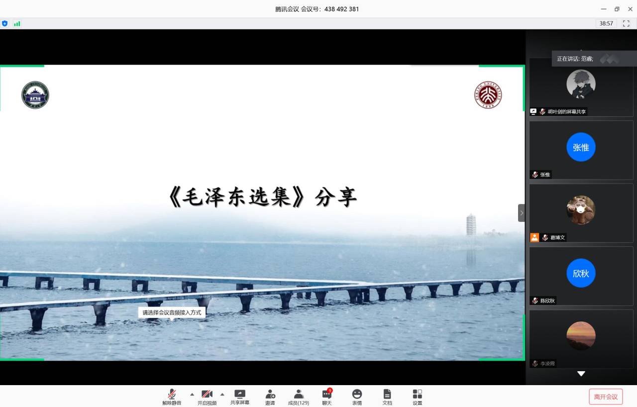 此次活动以腾讯会议为平台,来自武汉大学的周庆、单梓扬、范睿、王伟舟以及来自北京大学的杜泽宇、高逸辰等8位优秀的同学分别就自己阅读《毛泽东选集》及《邓小平时代》的感悟结合当下疫情做了分享。同时,北京大学物理学院党委副书记董晓华老师、专职辅导员王婧老师以及来自武汉大学物理科学与技术学院的团委书记卢丽珠老师以及弘毅学堂学生工作办公室主任程晓婷老师应邀参与此次活动。武汉大学物理科学与技术学院余晴主持此次读书会。