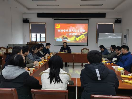 物理科学与技术学院物理第九党支部于2019年12月31日下午14点在物理学院老楼C-215召开谈心谈话活动。支部指导老师肖湘衡受邀出席本次谈心谈话活动并发表重要讲话。支部共15人参加活动,