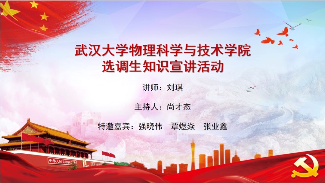 2020年3月21日晚,选调生知识宣讲活动——物理科学与技术学院专场通过腾讯会议APP顺利举行。本次分享会由武汉大学选调生发展研究会与武汉大学物理科学与技术学院研究生党总支共同承办,旨在通过分享选调生相关知识,为同学们提供精准就业服务。本次活动由物理学院党总支书记尚才杰同学主持。活动分为三个环节,分别为选调生知识宣讲、选调生校友分享备考经验和工作感悟、在线交流。