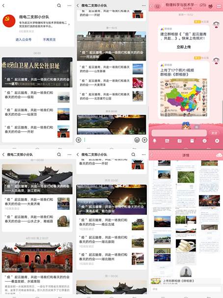 我们通过本支部微信公众号“微电二支部小分队”与QQ群与大家分享家乡的美景、美食、英雄人物,让我们欣赏到了不同地方的春天。各同志共赏春花美景,为中国加油,为武汉加油。我们欢迎各位小伙伴关注本支部微信公众号,来欣赏不同地方的特色美景,诚邀大家一起来云赏春。同时我们更应该发挥党员作用,为国家发展做贡献。在接下来的工作中,我们将会紧跟党的号召,在家认真工作,努力学习。在这个非常时期大家一定要注意休息,做好个人防护。希望大家齐心协力,坚决打赢这场疫情防控阻击战,早日回“珈”。