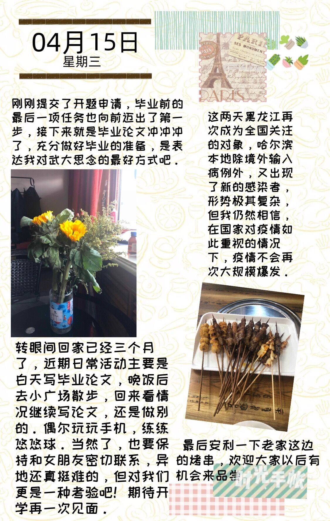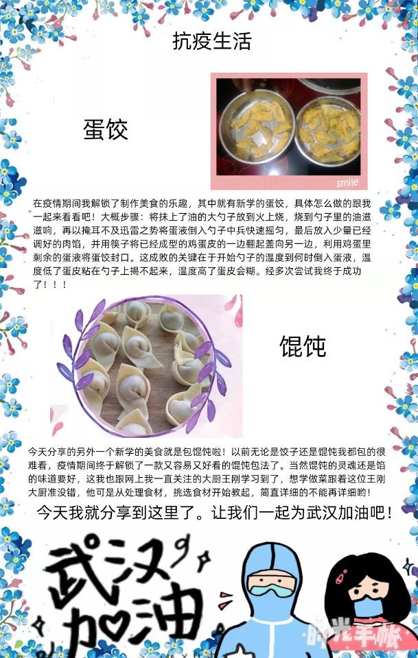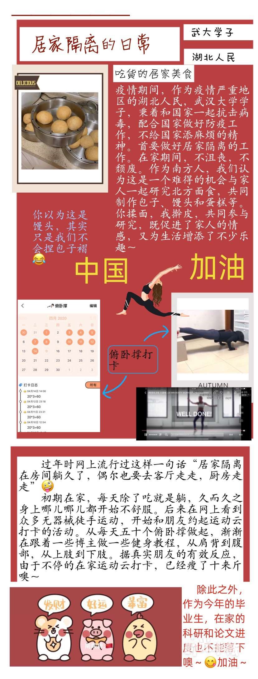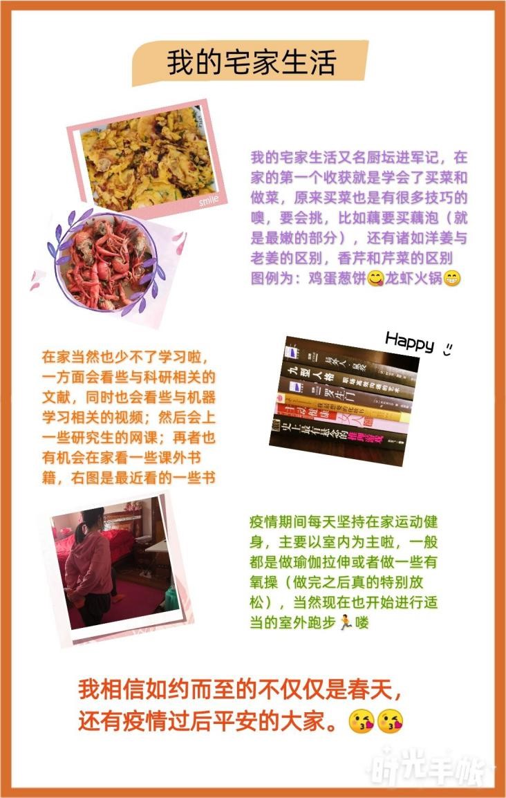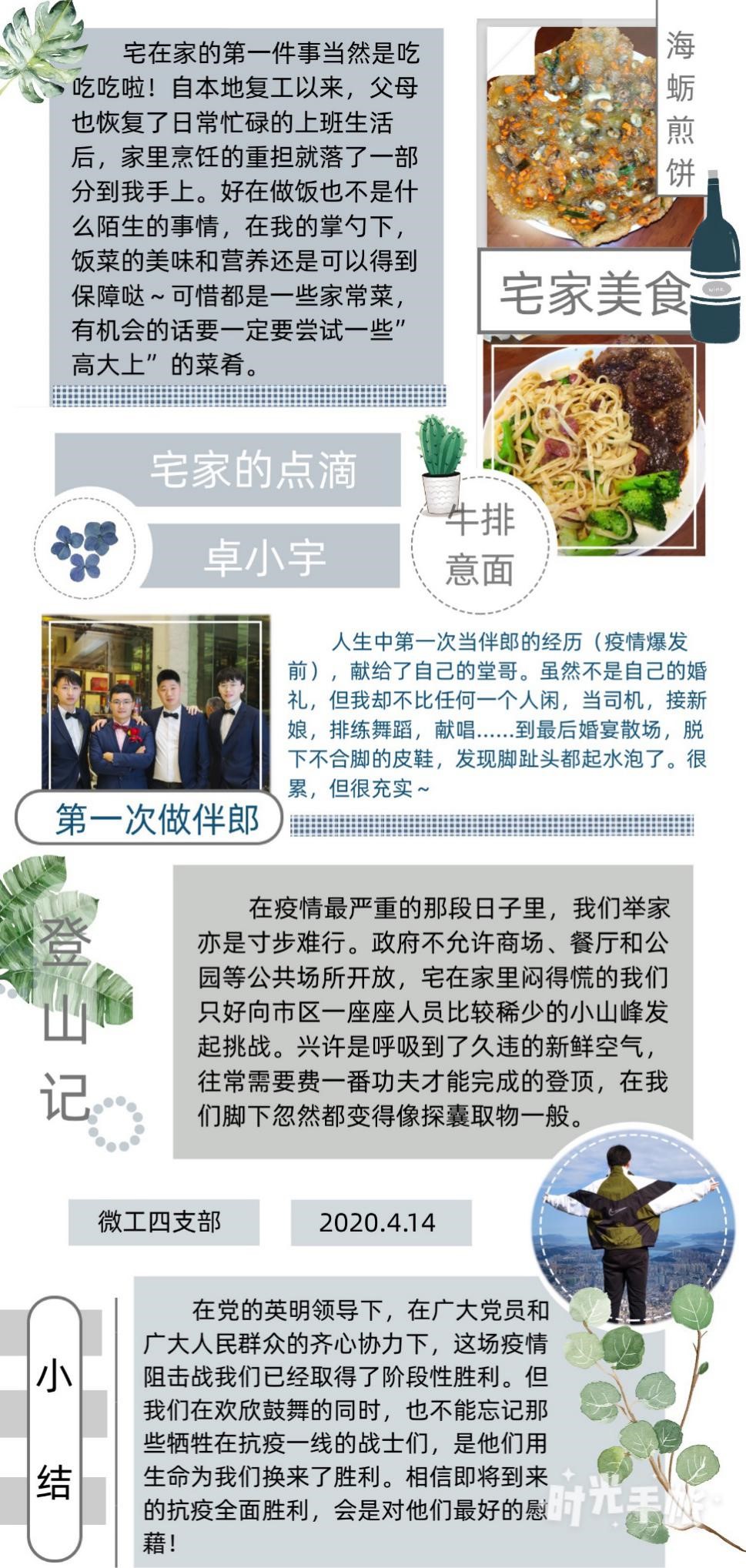 【生活类手账展示】苦中作乐悟真义。首先,卓小宇同志分享了自己充实的假期生活,其中包括自己烹饪美食,第一次做伴郎的经历(疫情发生之前)以及去空旷的小山峰攀登并轻松登顶的小故事。孙晟珂同志也分享了自己的生活,其中包括疫情防控课的学习以及介绍了家乡美景。李泽同志也分享了自己的居家美食、宅家运动,并展望了毕业后就业计划等。席英男同志给大家介绍老家东北地区严控境外疫情输入的措施,也分享了家乡的美食,表达了对疫情早日结束的美好祝愿。余腾飞、陈意、邹凤华三位同志也给大家分享了疫情期间在家的生活点滴。